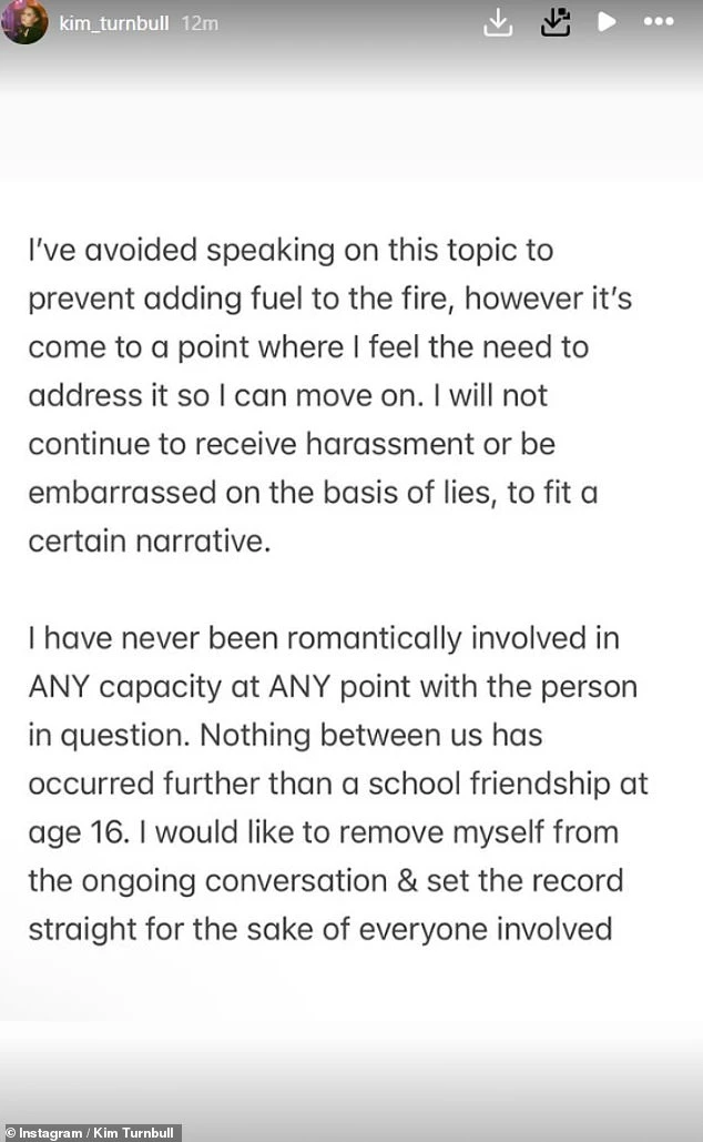 Kim Turnbull, nữ người mẫu 24 tuổi, phủ nhận hoàn toàn tin đồn từng yêu Brooklyn Beckham trước khi hẹn hò Romeo Beckham và cho biết giữa họ chỉ đơn thuần là tình bạn tuổi teen. Cô nhấn mạnh chưa từng có bất kỳ mối quan hệ lãng mạn nào với Brooklyn ở bất kỳ thời điểm nào, đồng thời khẳng định mình đang bị lôi vào những câu chuyện không liên quan, trở thành “vật tế thần” trong cuộc chiến dai dẳng của gia đình Beckham.