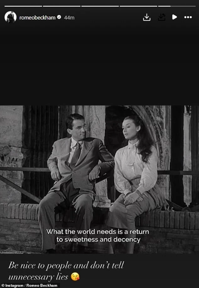 Giữa lúc lùm xùm về mối quan hệ tay ba giữa Romeo Beckham – Kim Turnbull – Brooklyn Beckham gây xôn xao mạng xã hội , cậu 2 nhà Beckham vừa có động thái đáng chú ý. Trên Instagram, chàng cầu thủ 22 tuổi đăng ảnh trích từ bộ phim Roman Holiday cùng dòng chú thích đầy ẩn ý: “Hãy tử tế với mọi người và đừng lan truyền những lời nói dối không cần thiết”.