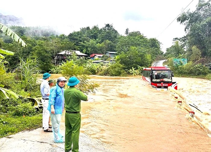 Xe khách chở 15 người đang lưu thông qua cầu tràn tại xã Ngọc Đường (Tuyên Quang) bất ngờ bị chết máy, mắc kẹt giữa dòng nước lũ.