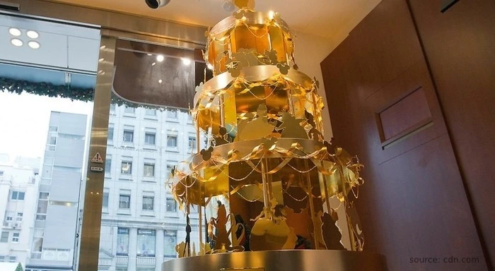Cây thông Noel bằng vàng nguyên khối Ginza Tanaka tại Tokyo (Nhật Bản) được trưng bày vào năm 2012, có chi phí lên hơn 4,2 triệu USD.