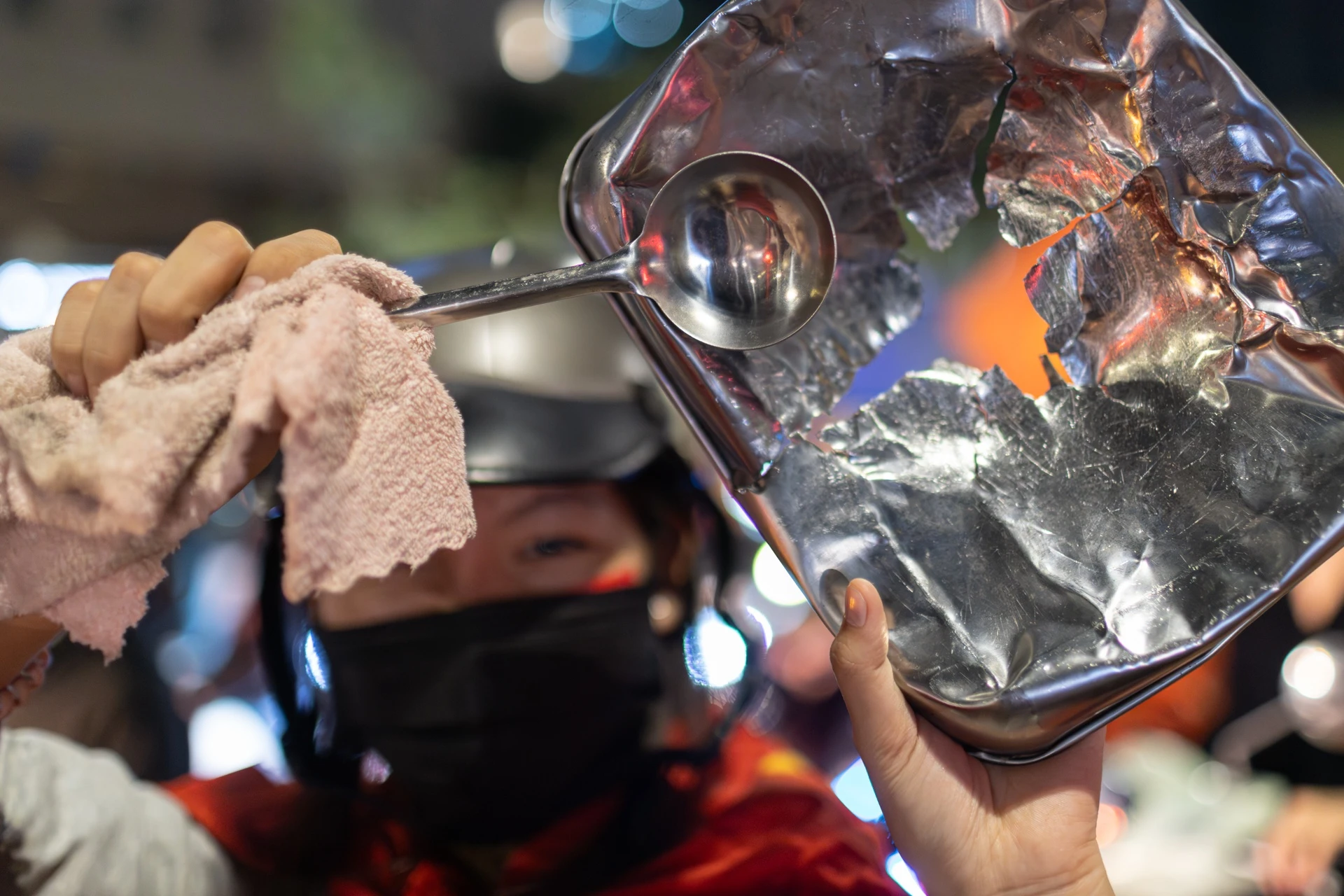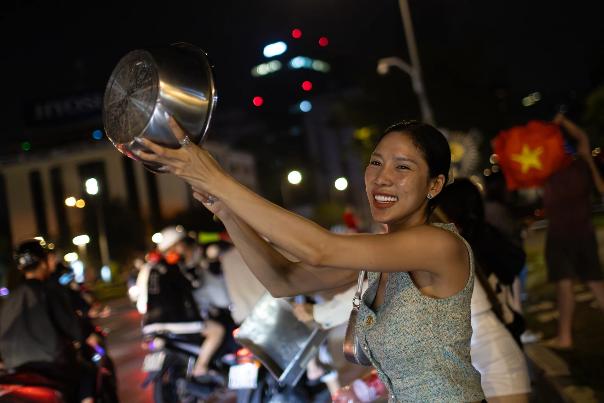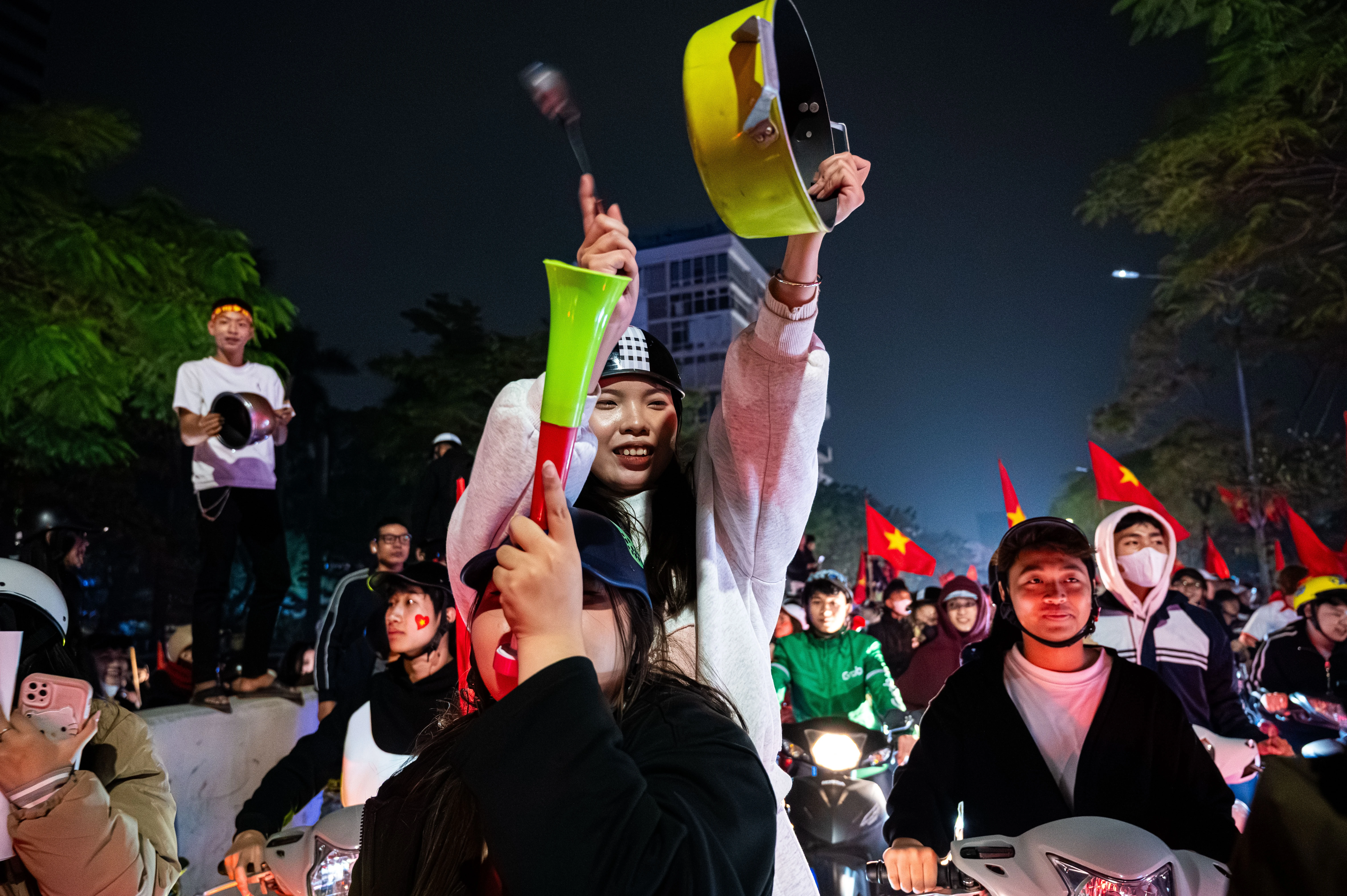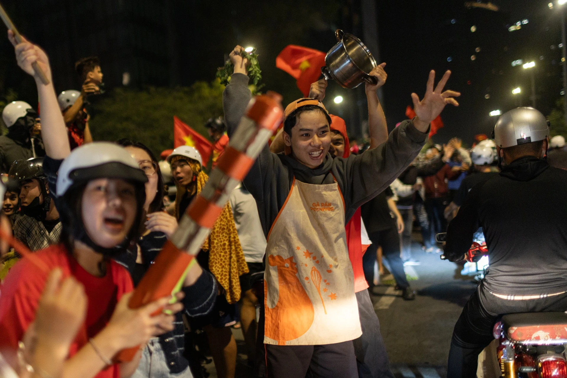 Nhiều cổ động viên dùng nắp nồi, xoong, chảo và muôi làm nhạc cụ tự chế, tạo nên âm thanh vui tai và sôi động giữa không khí ăn mừng trên đường phố.