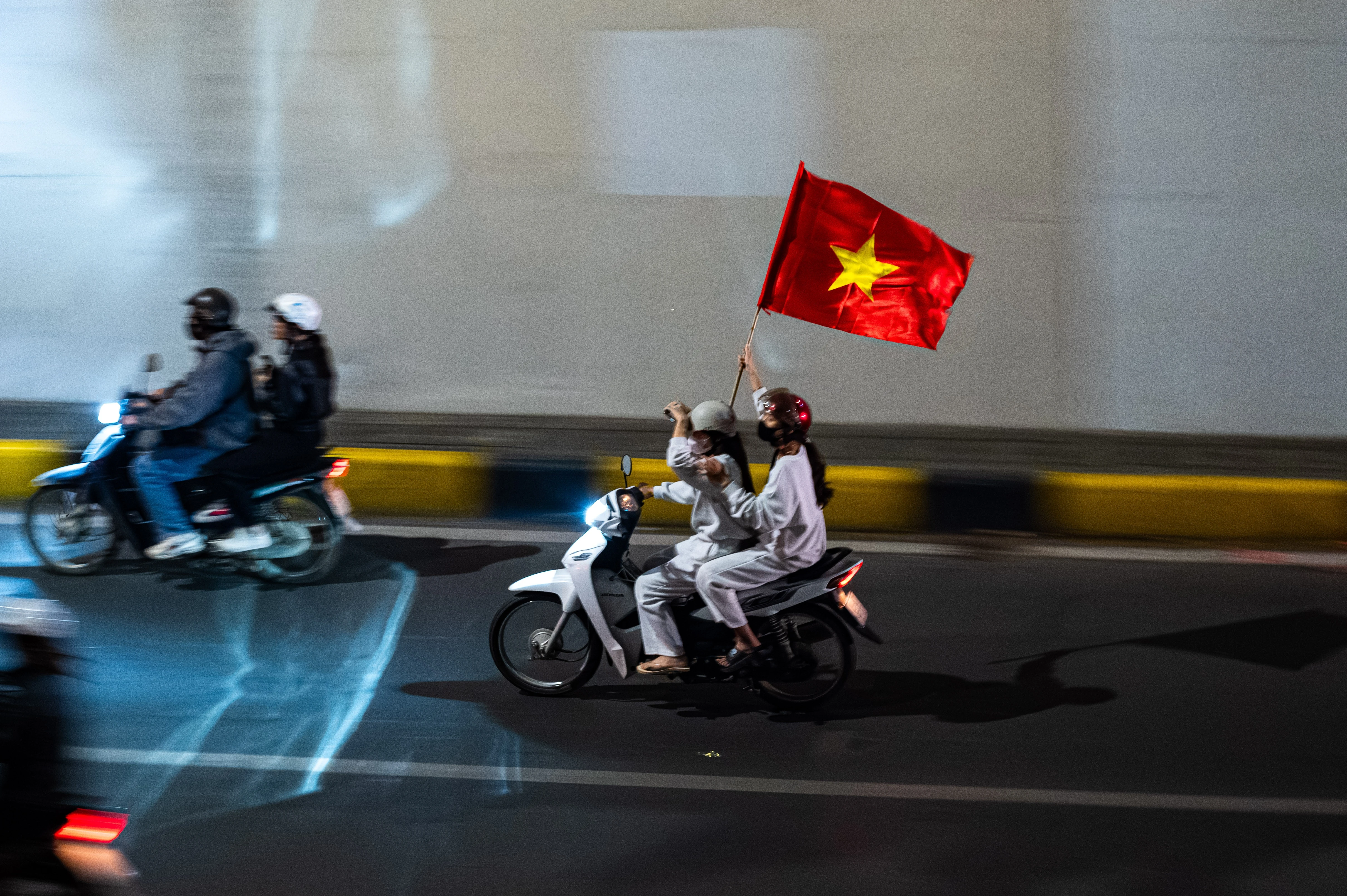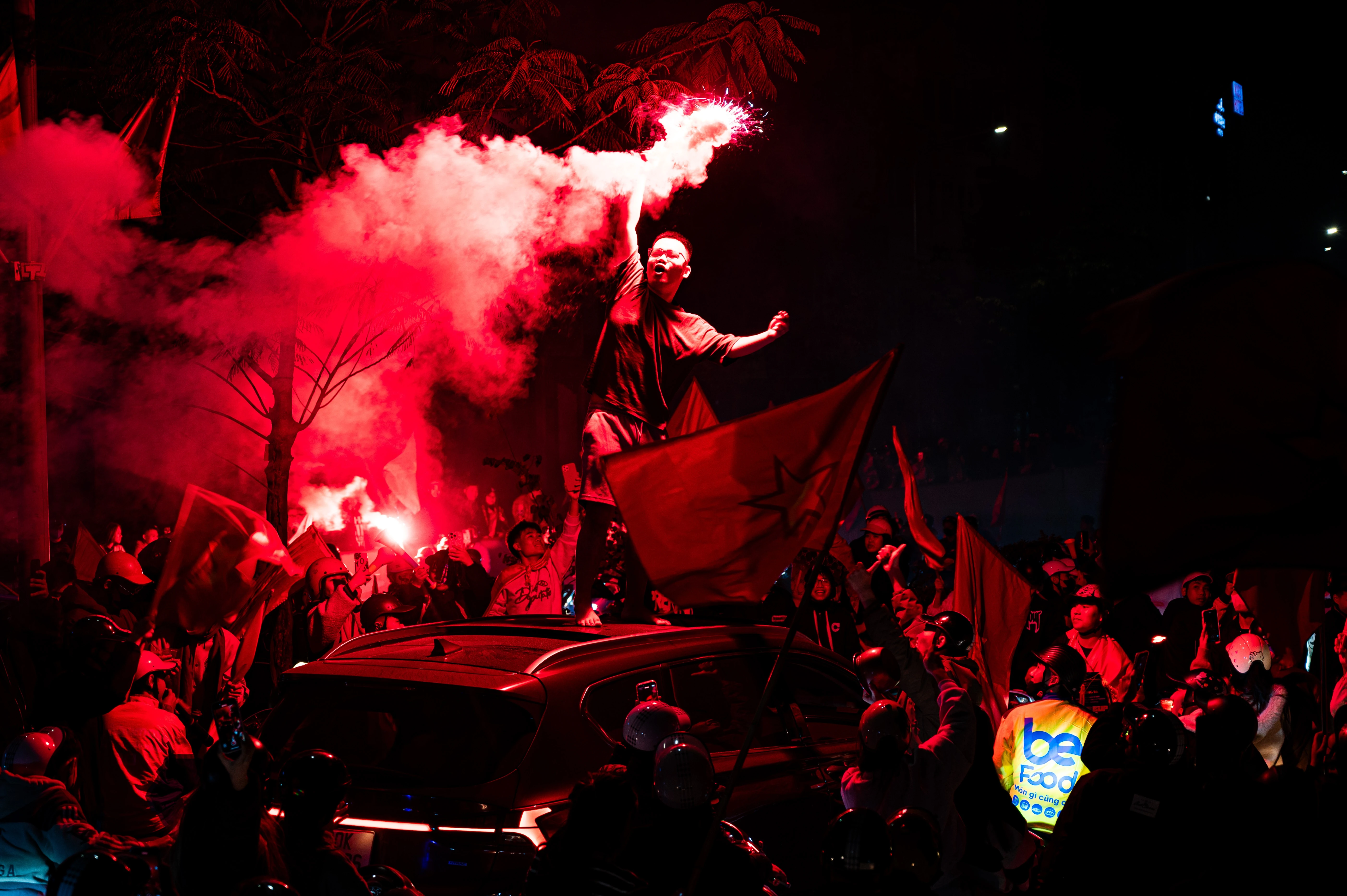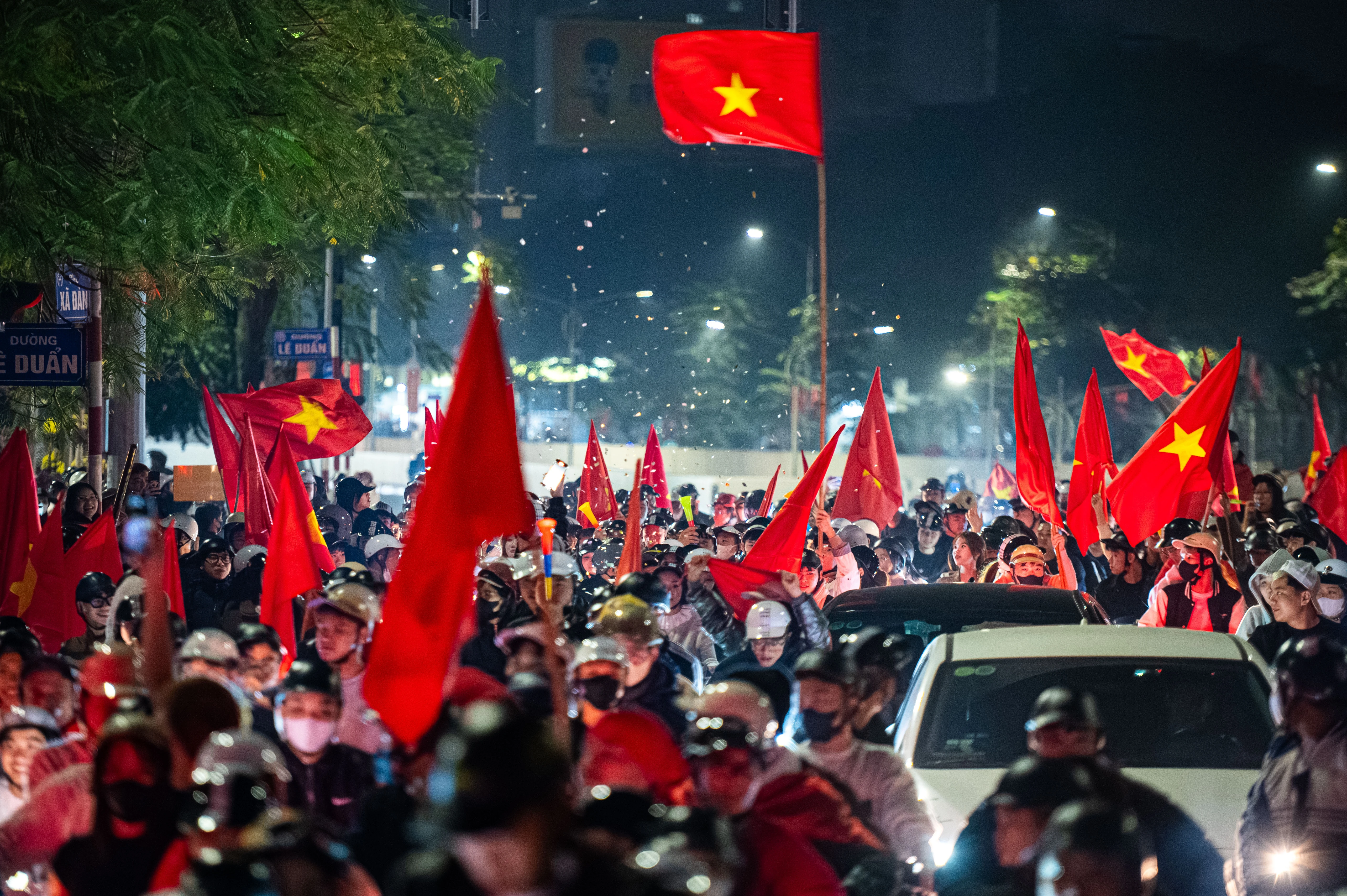 3h sáng 21/1, không khí tại hầm chui Kim Liên vẫn không có dấu hiệu hạ nhiệt. Cổ động viên đi "bão" nhuộm đỏ cả cung đường bằng lá cờ đỏ sao vàng.