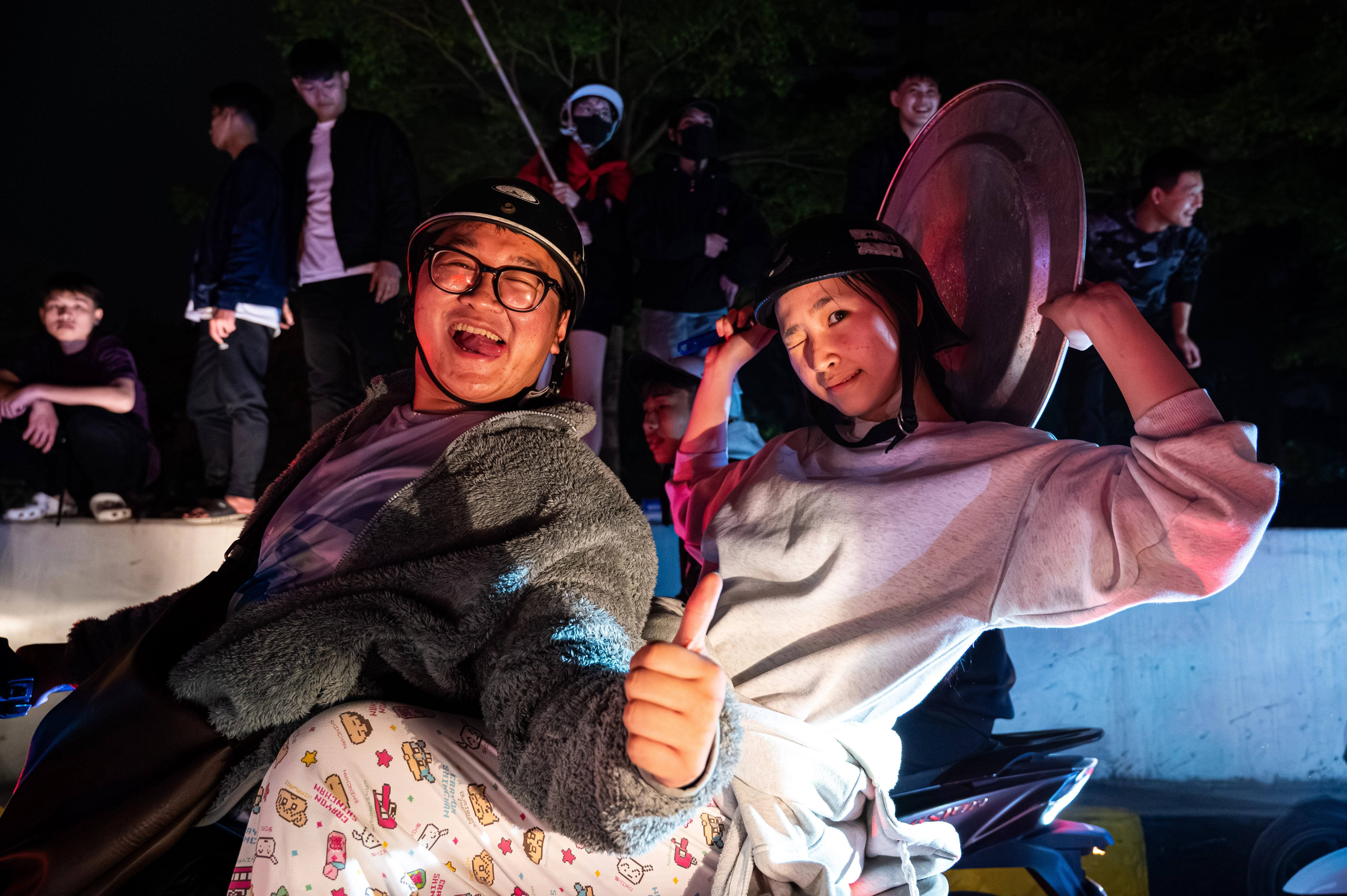 Các bạn trẻ mang nồi, xoong, cây để “đi bão”, khuấy động không khí.
