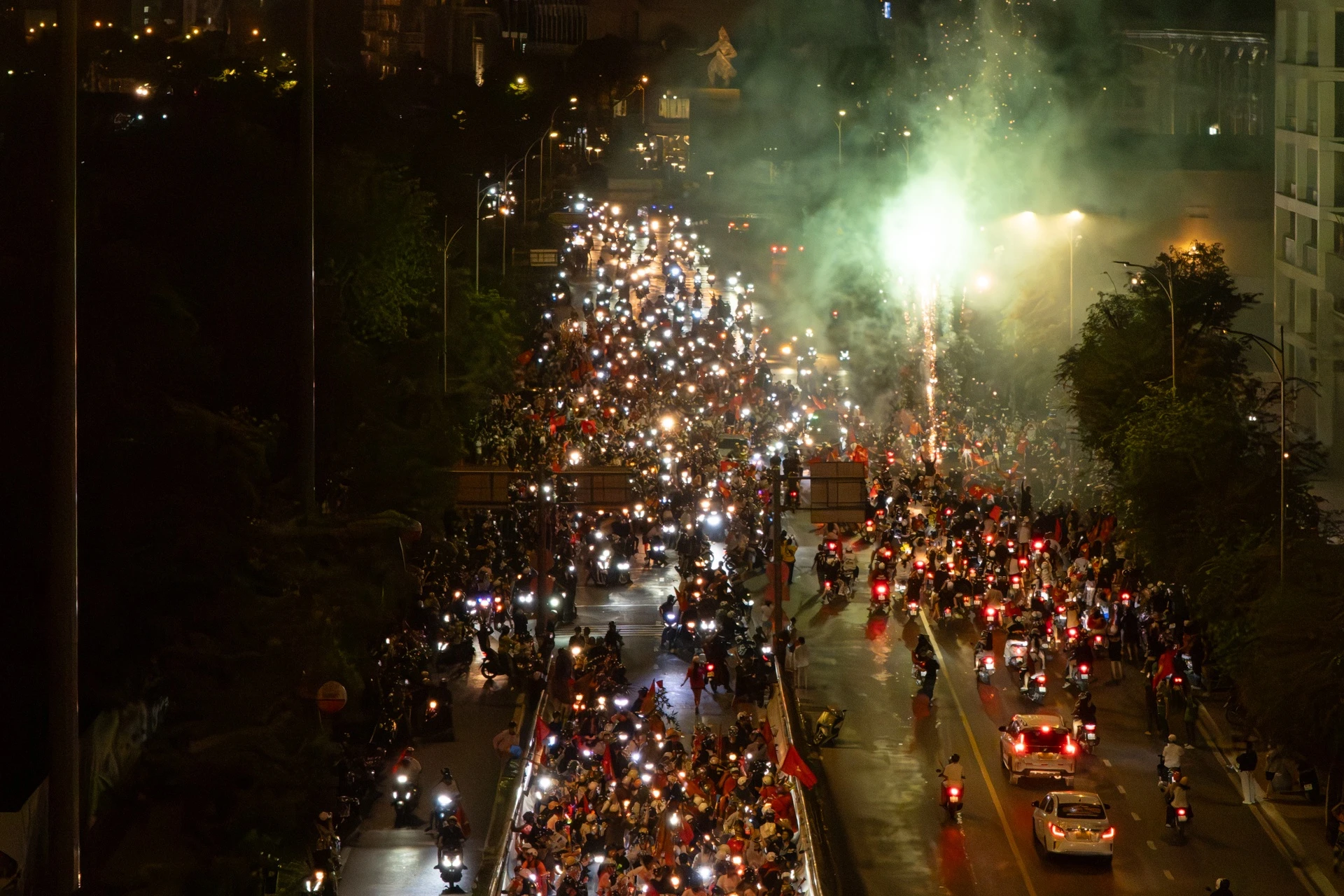 Nhóm thanh niên đốt pháo sáng ở khu vực đường Tôn Đức Thắng khiến đám đông phấn khích , reo hò.