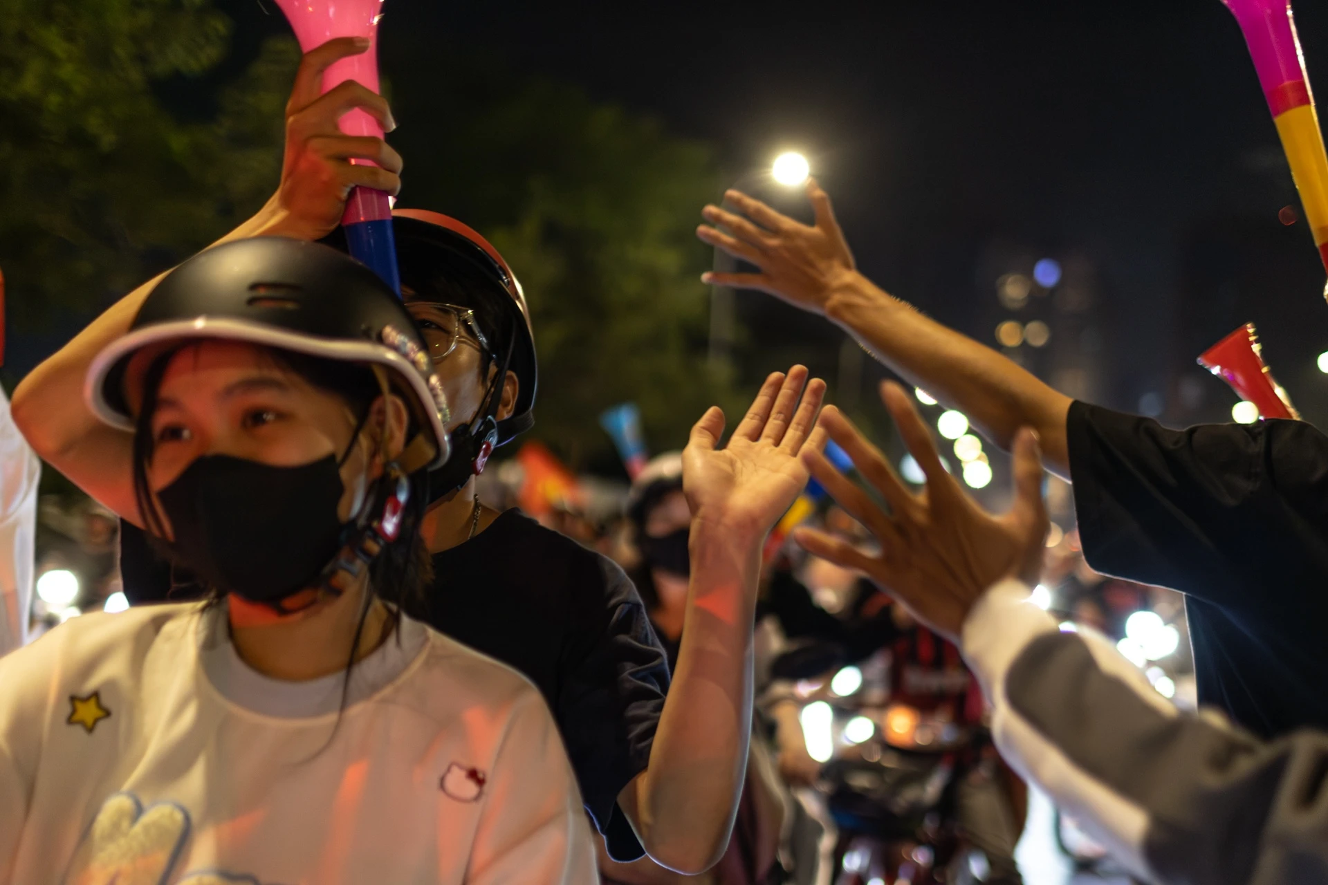 "Các cầu thủ U23 Việt Nam đã thi đấu quả cảm, tiến vào đến vòng bán kết đã là một thành công lớn, vì thế tôi vẫn hòa vào dòng người đi 'bão' dù kết quả có ra sao. Dù sáng vẫn phải đi học sớm, nhưng chúng tôi cứ vui hết mình đêm nay", Đoàn Thị Cẩm Tú (sinh viên Đại học Ngân hàng) nói.