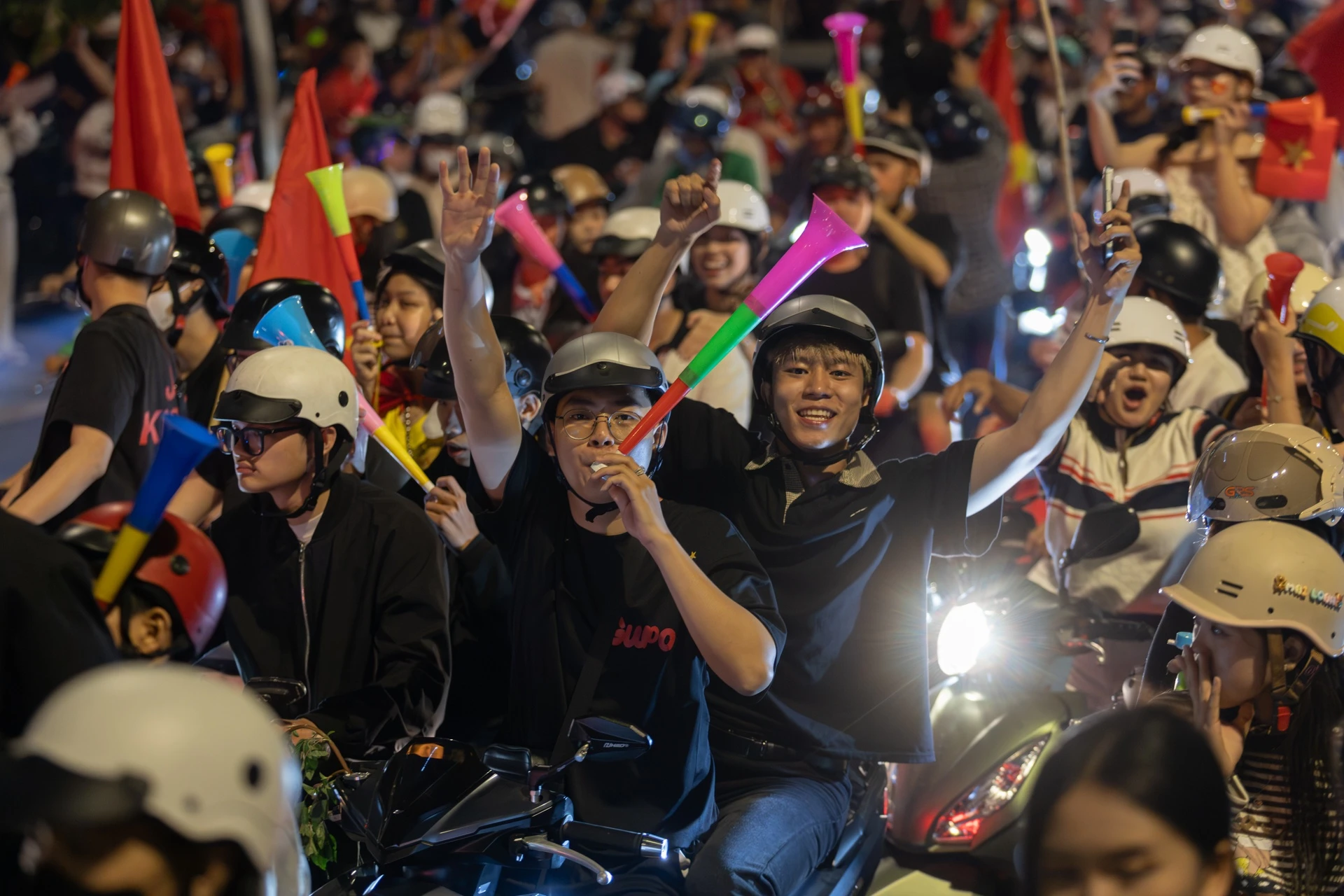 Rạng sáng 24/1, sau chiến thắng của U23 Việt Nam trước U23 Hàn Quốc, hàng nghìn cổ động viên tại TP.HCM đổ ra các tuyến đường trung tâm “đi bão”.