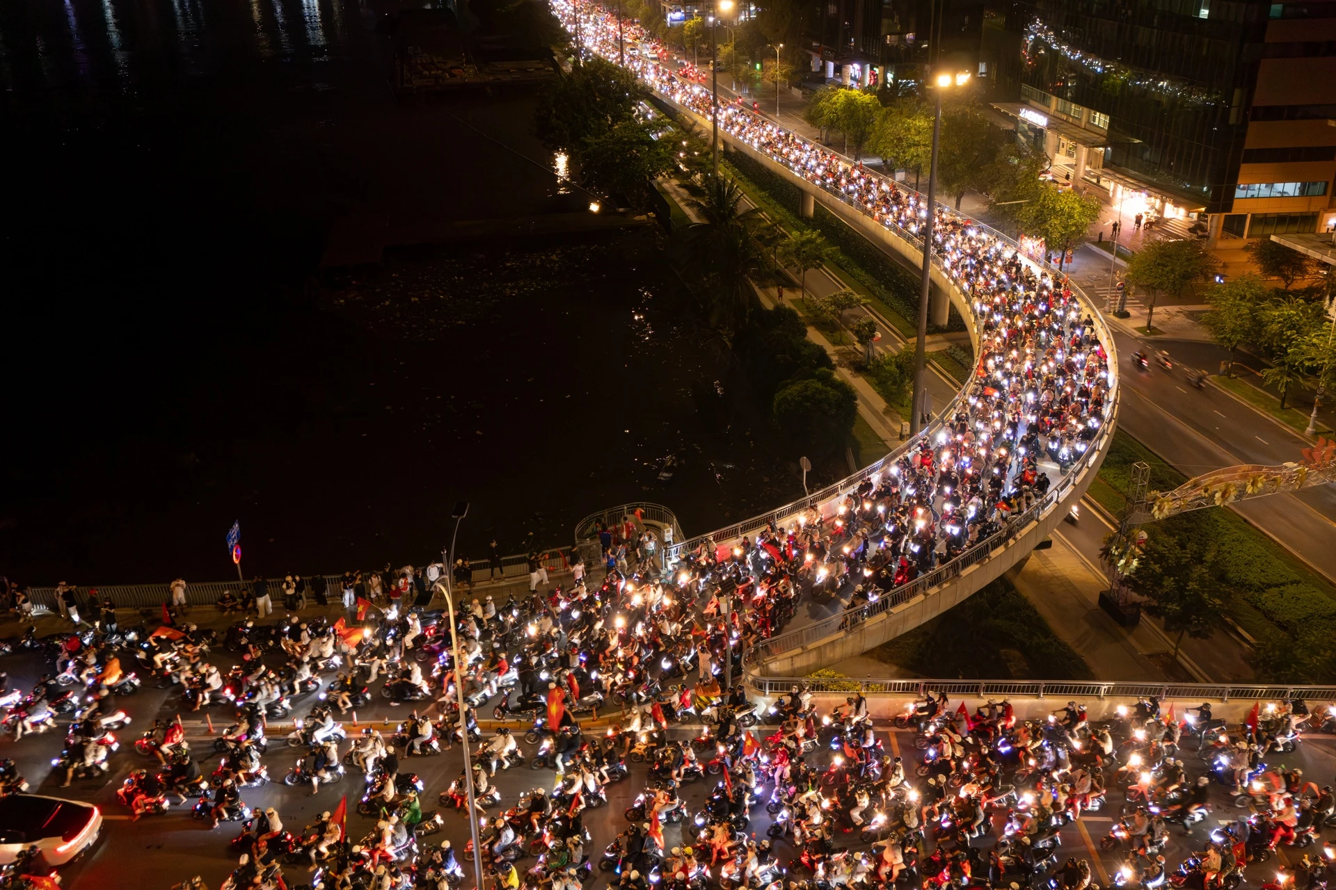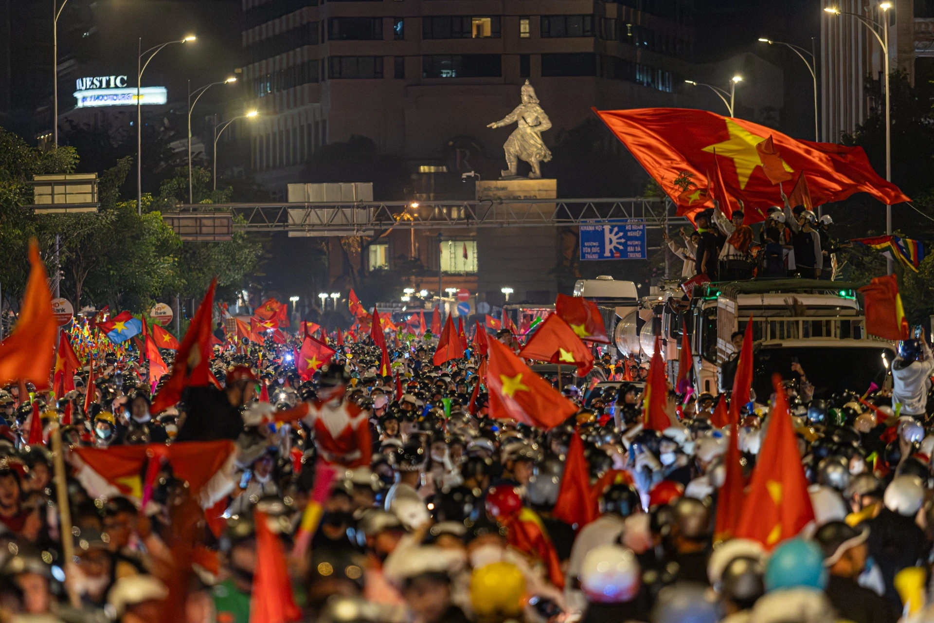 Rạng sáng 21/1, người hâm mộ Việt Nam trải qua một đêm đáng nhớ với chiến thắng đầy tự hào của U23 Việt Nam trước U23 Hàn Quốc. Khoảng 2h sáng, đông đảo cổ động viên có mặt tại các khu vực trung tâm TP.HCM như cầu Ba Son, đường Tôn Đức Thắng, chợ Bến Thành để “đi bão”.
