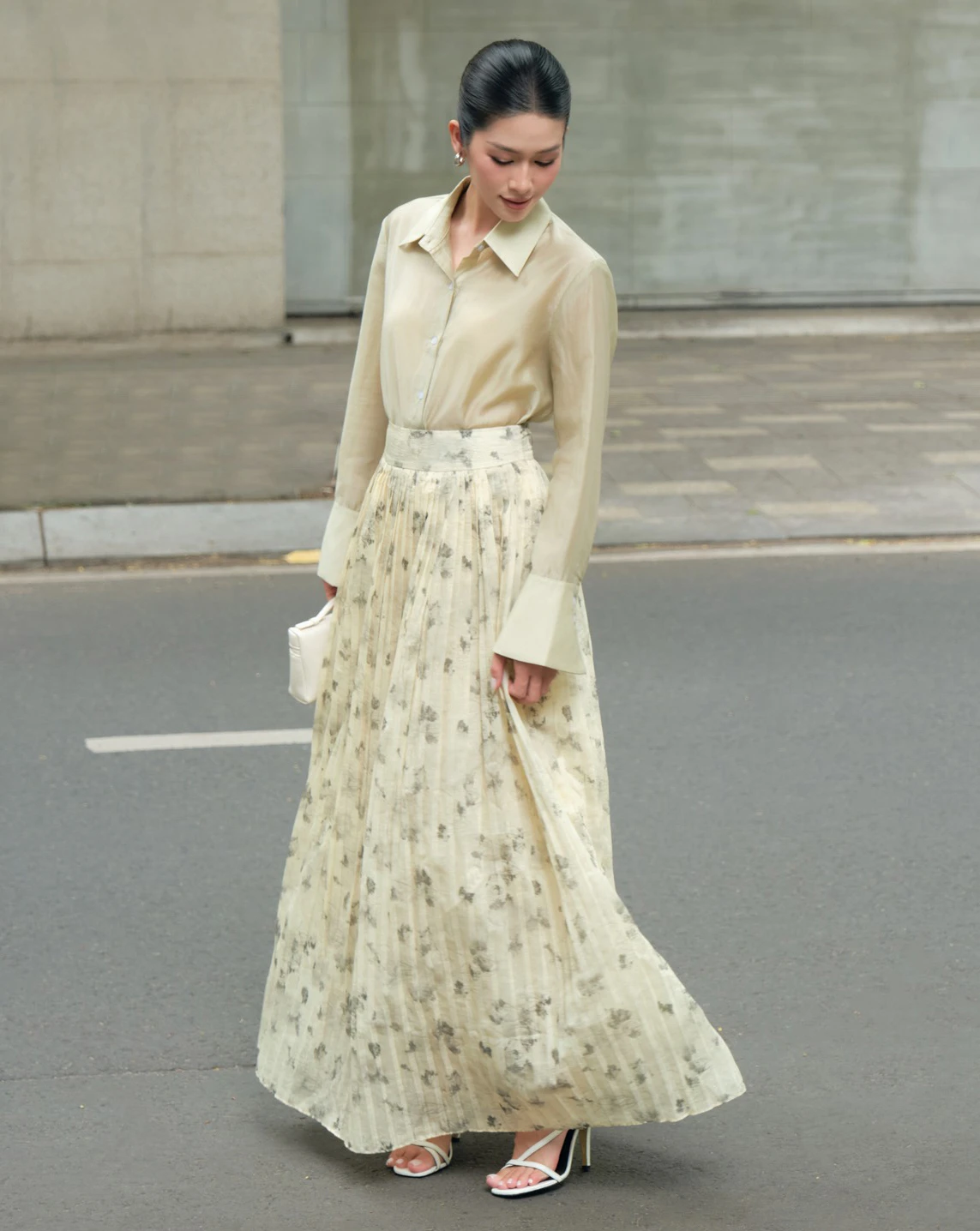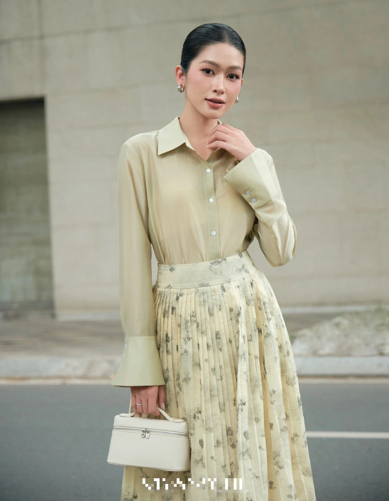 Gam màu xanh bơ dịu mát, nhẹ nhàng và giàu nữ tính được kết hợp một cách khéo léo qua bản phối. Thiết kế chân váy in họa tiết xếp ly hòa hợp với áo sơ mi organza dài tay và xăng đan cao gót