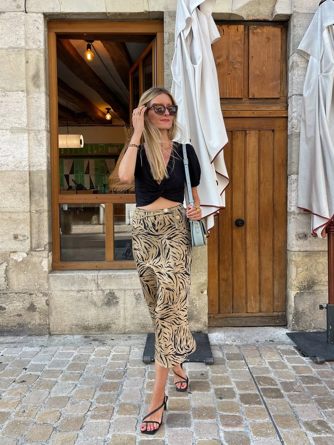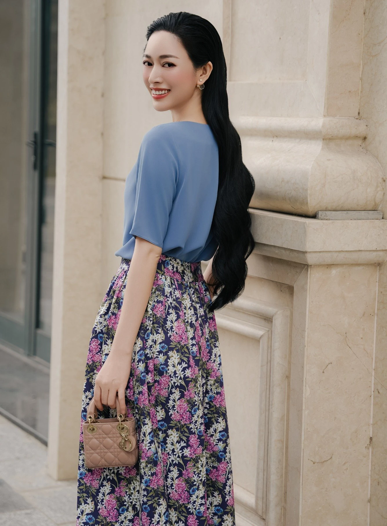Không quá kén chọn kiểu áo mặc cùng, chân váy midi in hoa là bảo chứng cho hình ảnh sang trọng, thanh lịch và cuốn hút một cách tự nhiên.
