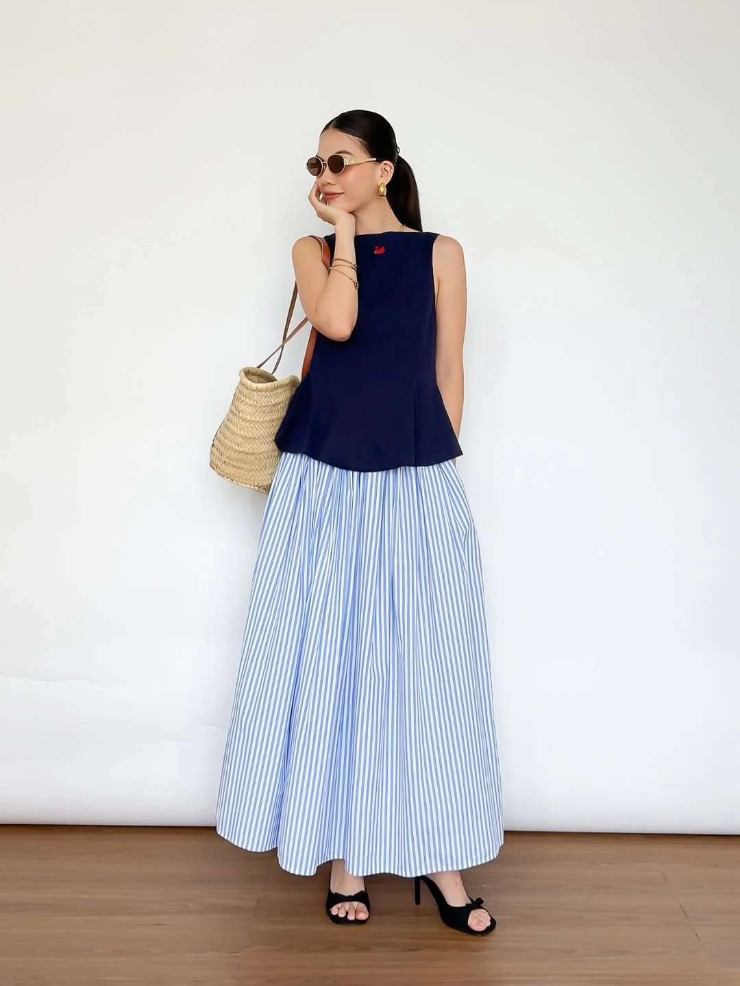 Chân váy kẻ sọc mang theo cả tinh thần mùa hè vào trong từng sọc kẻ màu làm nên thiết kế chân váy midi dáng rộng. Xanh dương nhạt và xanh đen, đen tạo nên bộ ba màu sắc ăn ý kết hợp cùng túi màu beige đẹp miễn chê