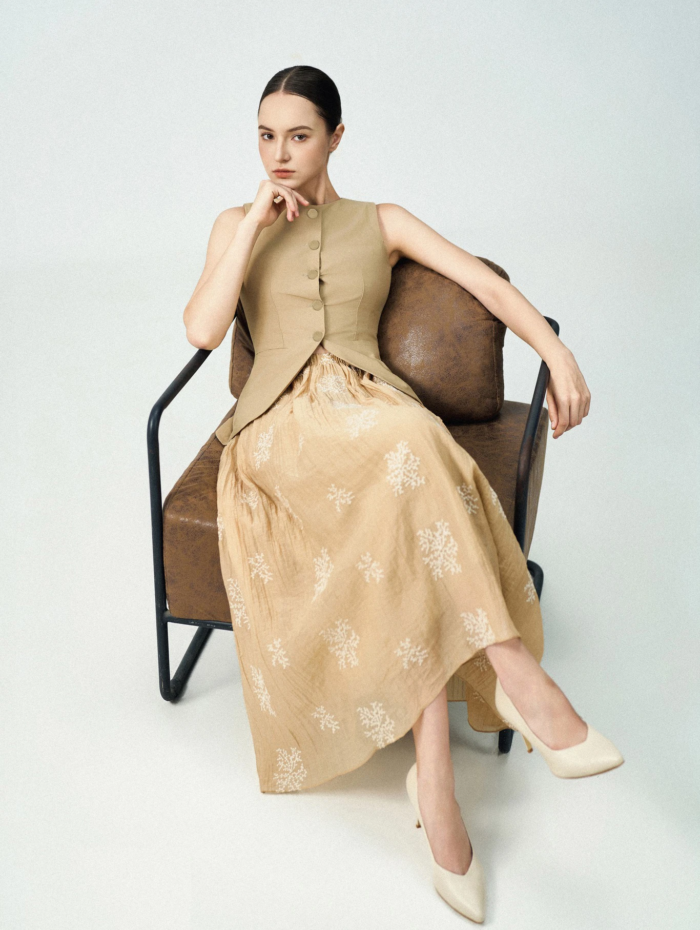 Áo vest không tay, áo gile vốn là món đồ đại diện cho nét tính cách mạnh mẽ, bản lĩnh và tính quyết đoán của quý cô. Khi mặc cùng chân váy tơ hoa, hình ảnh trở nên cân bằng, hài hòa và mềm mại hơn hẳn