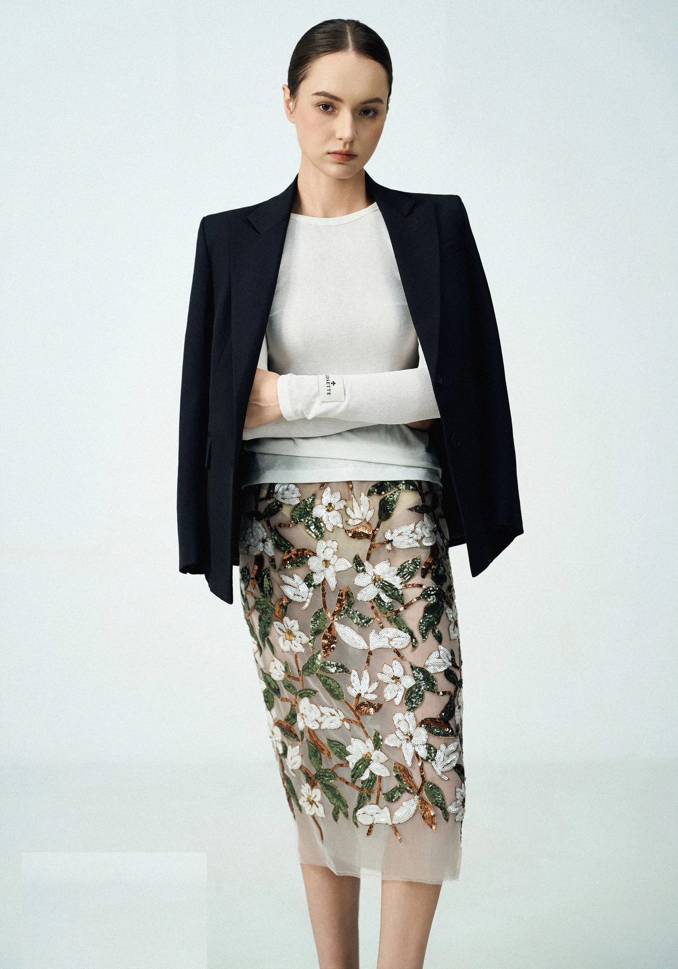Chân váy sheer thêu hoa lá lấp lánh độc đáo tạo nên bản phối phá cách táo bạo cho nàng dự tiệc, dự sự kiện. Để tăng hiệu quả thẩm mỹ, hãy đảm bảo diện nội y màu da, áo dệt kim mỏng nhẹ và một chiếc blazer đơn sắc có độ dài đủ để bảo vệ nàng trước các tình huống "kém duyên"