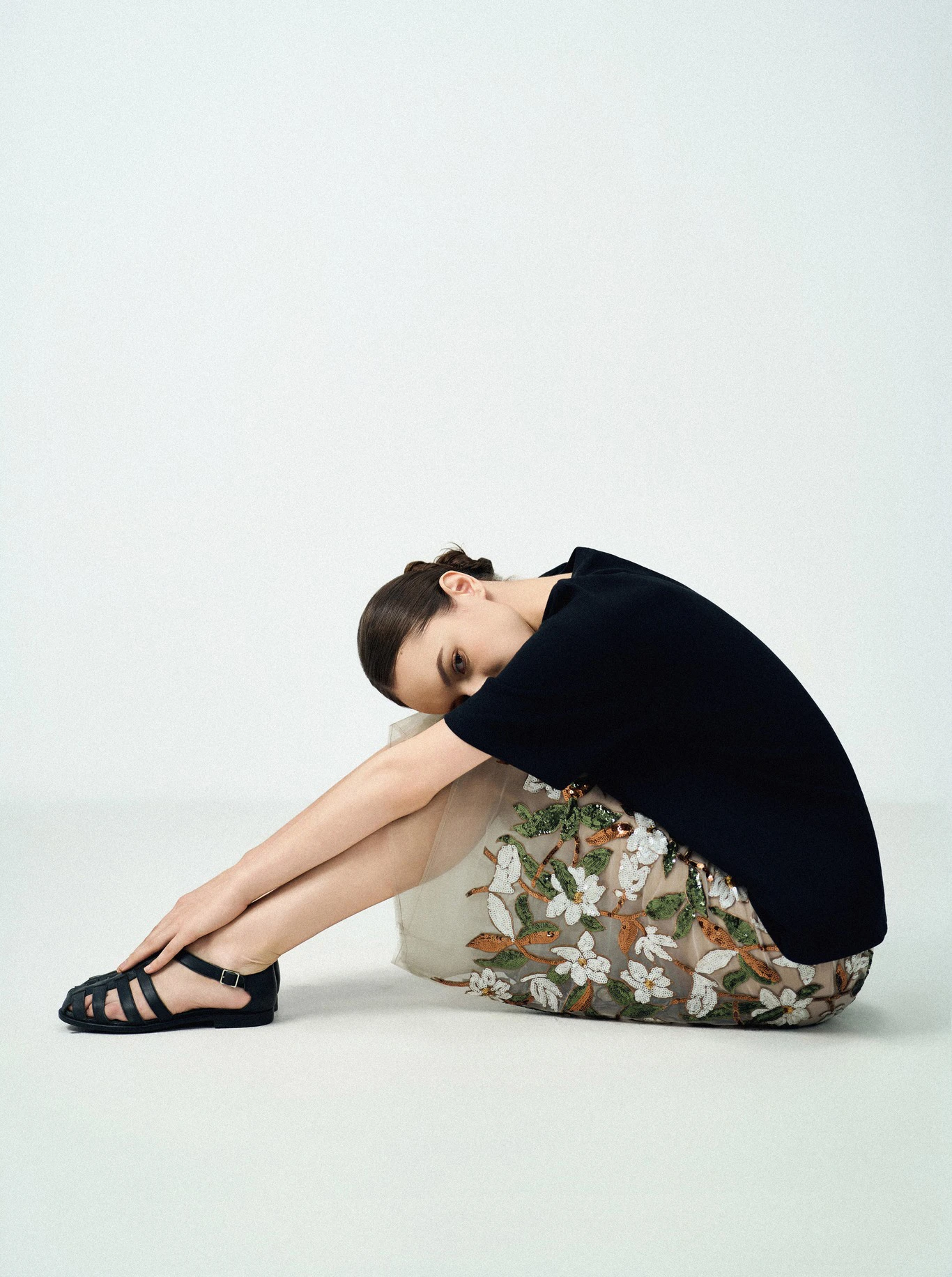 Chân váy hoa mùa này gợi nhắc tinh thần của thời trang cổ điển. Dù là họa tiết hoa in trên vải voan tơ hay họa tiết hoa lá thêu trên nền vải sheer xuyên thấu, họa tiết dệt nổi trên bề mặt chất liệu thì sức quyến rũ từ những món đồ này là điều không thể bàn cãi.