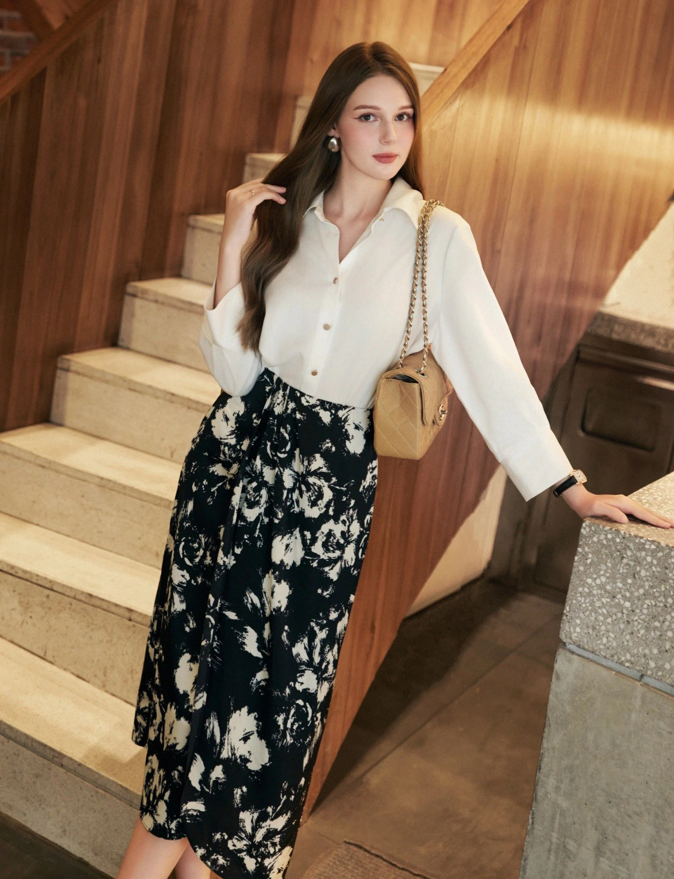 Áo kiểu và chân váy in hoa dáng midi hoàn hảo cho mọi khung hình, mọi hoàn cảnh. Nếu muốn tạo hiệu ứng thị giác thon gọn cho phần thân trên, quý cô hãy chọn gam màu tối cho áo và ưu tiên sự nổi bật cho phần thân dưới - váy dài có màu sắc nổi bật đi cùng các họa tiết hoa lá tươi vui, giàu sức sống