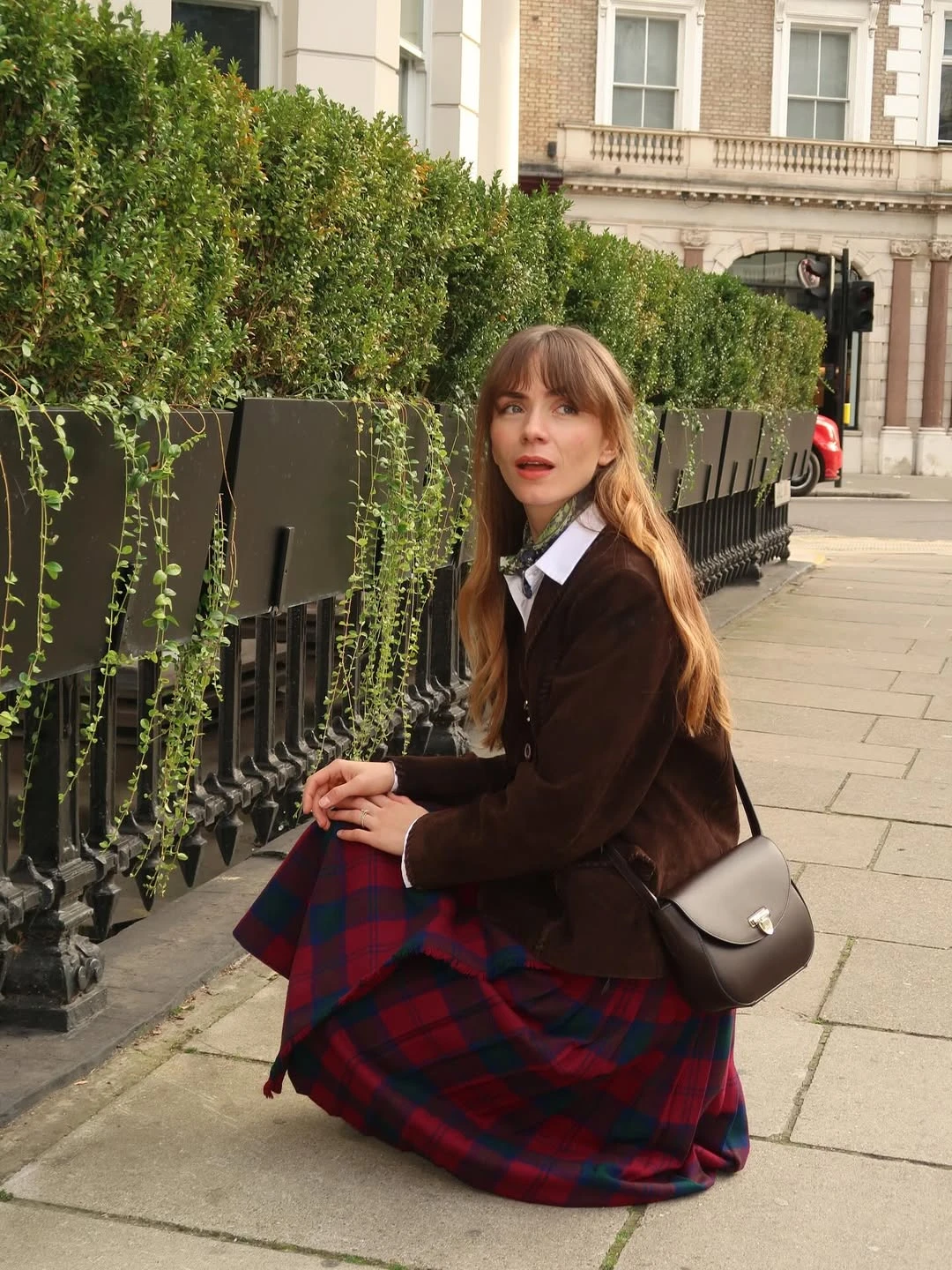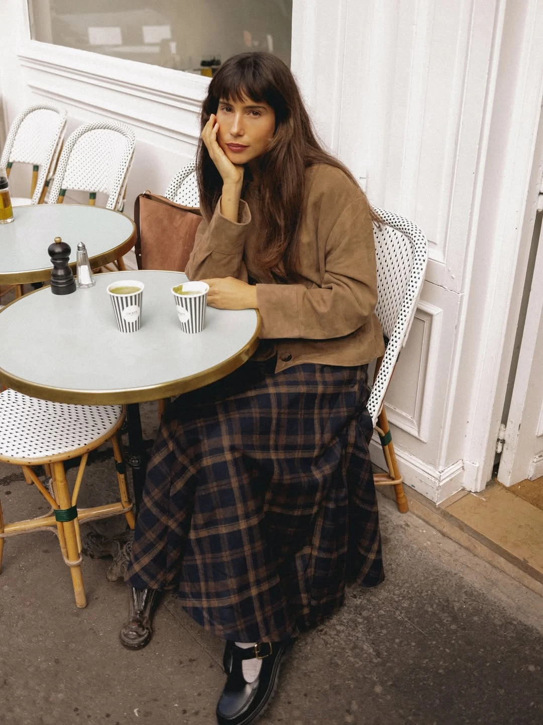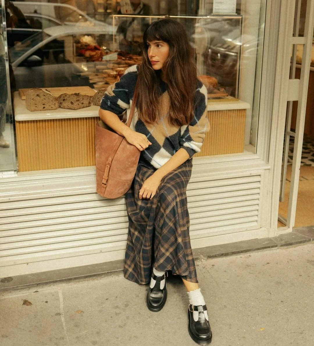Áo khoác da lộn, áo len cổ tròn, cardigan, sơ mi, áo dệt kim tay dài… là những ứng cử viên hàng đầu để mặc cùng chân váy ca rô dáng dài. ẢNH: BELEN HOSTALET