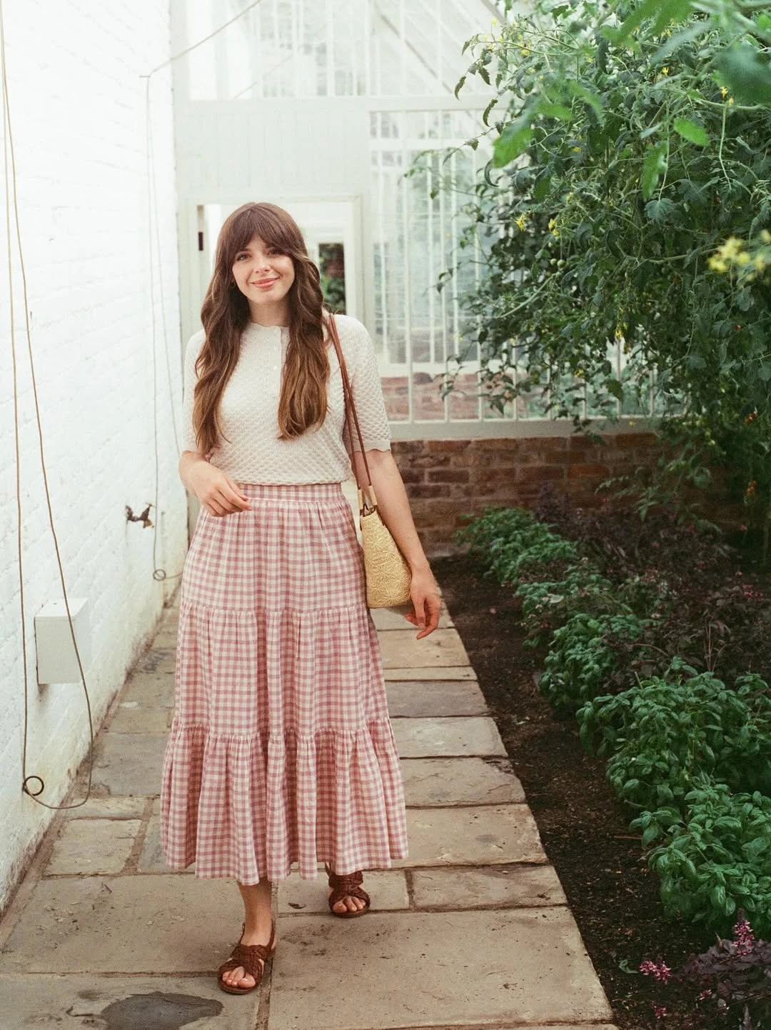 Họa tiết kẻ ô gingham tông hồng tạo nên nét trẻ trung cho bản phối dạo phố hay trang phục casual thường ngày . ẢNH: SOPHIA ROSEMARY