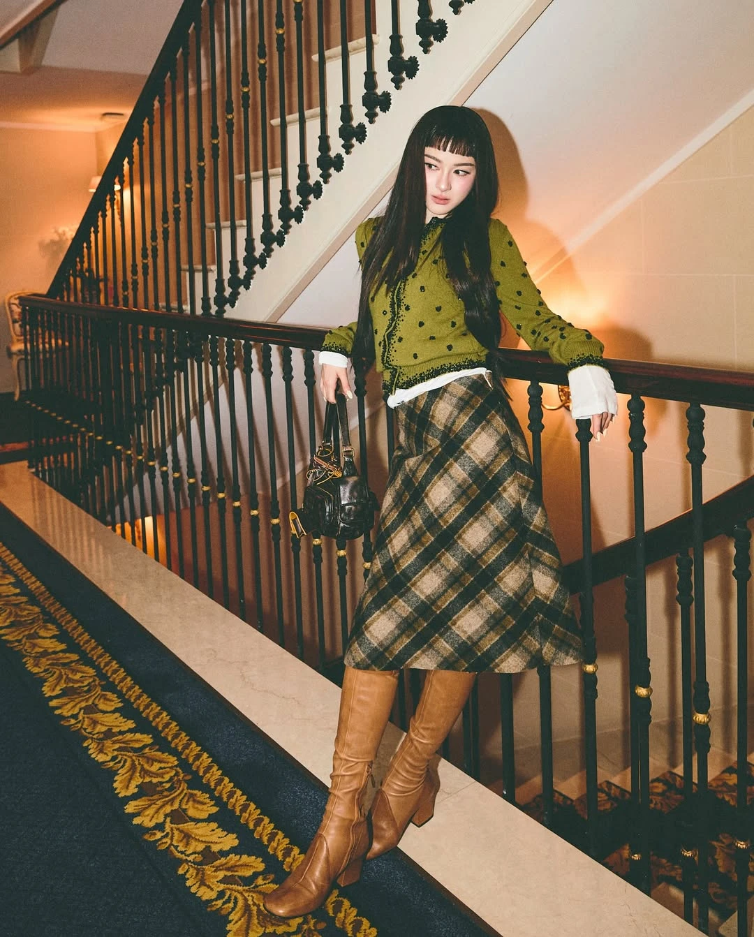 Các gam màu xu hướng được kết hợp khéo léo tạo nên tổng thể hoàn hảo – cardigan xanh ô liu, chân váy chữ A dáng midi và giày bốt màu nâu hạt dẻ . ẢNH: PRIM CHANIKARN