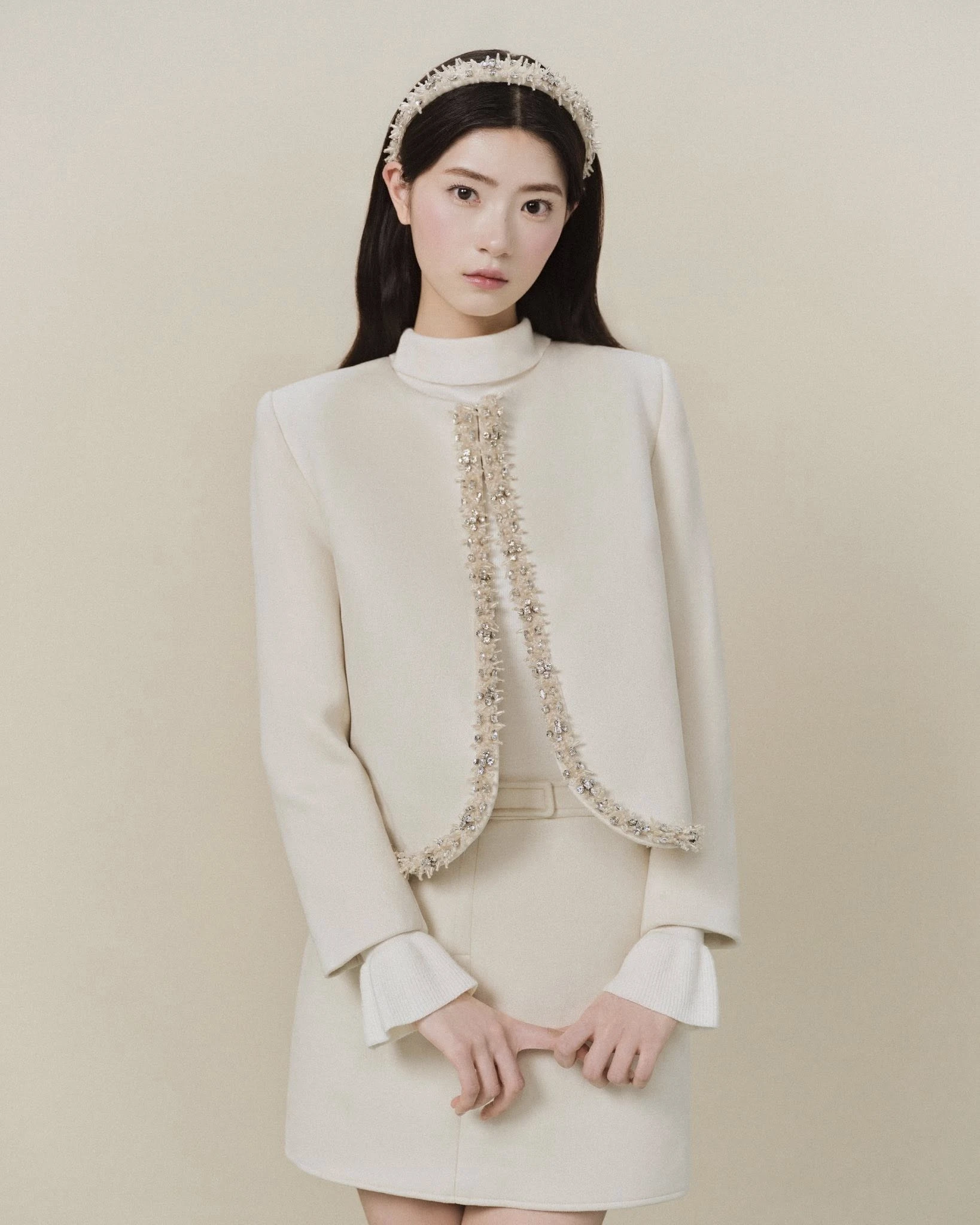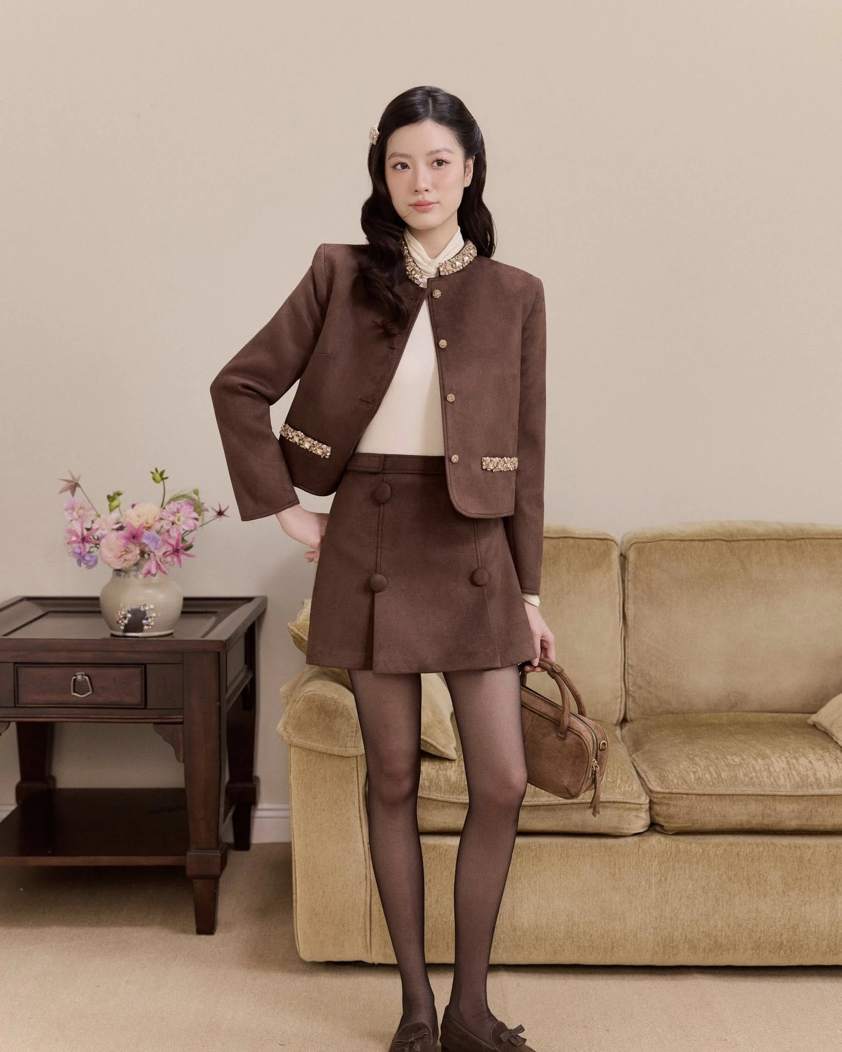 Chiếc áo khoác gây ấn tượng với dáng suông nữ tính, phom đứng gọn gàng và đường viền đính đá tinh xảo, vạt cong mềm mại giúp bản phối hài hòa, thanh lịch. Kết hợp cùng chân váy tối giản, chất da lộn sang trọng mang đến chiều sâu tinh tế