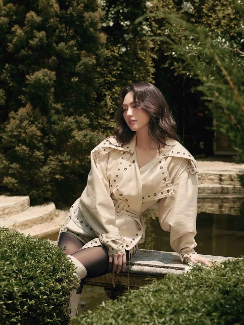 Chiếc áo khoác hờ trên vai cùng phụ kiện khuyên tai bản lớn tạo điểm nhấn cá tính, trong khi mái tóc tết gọn gàng tôn lên đường nét gương mặt