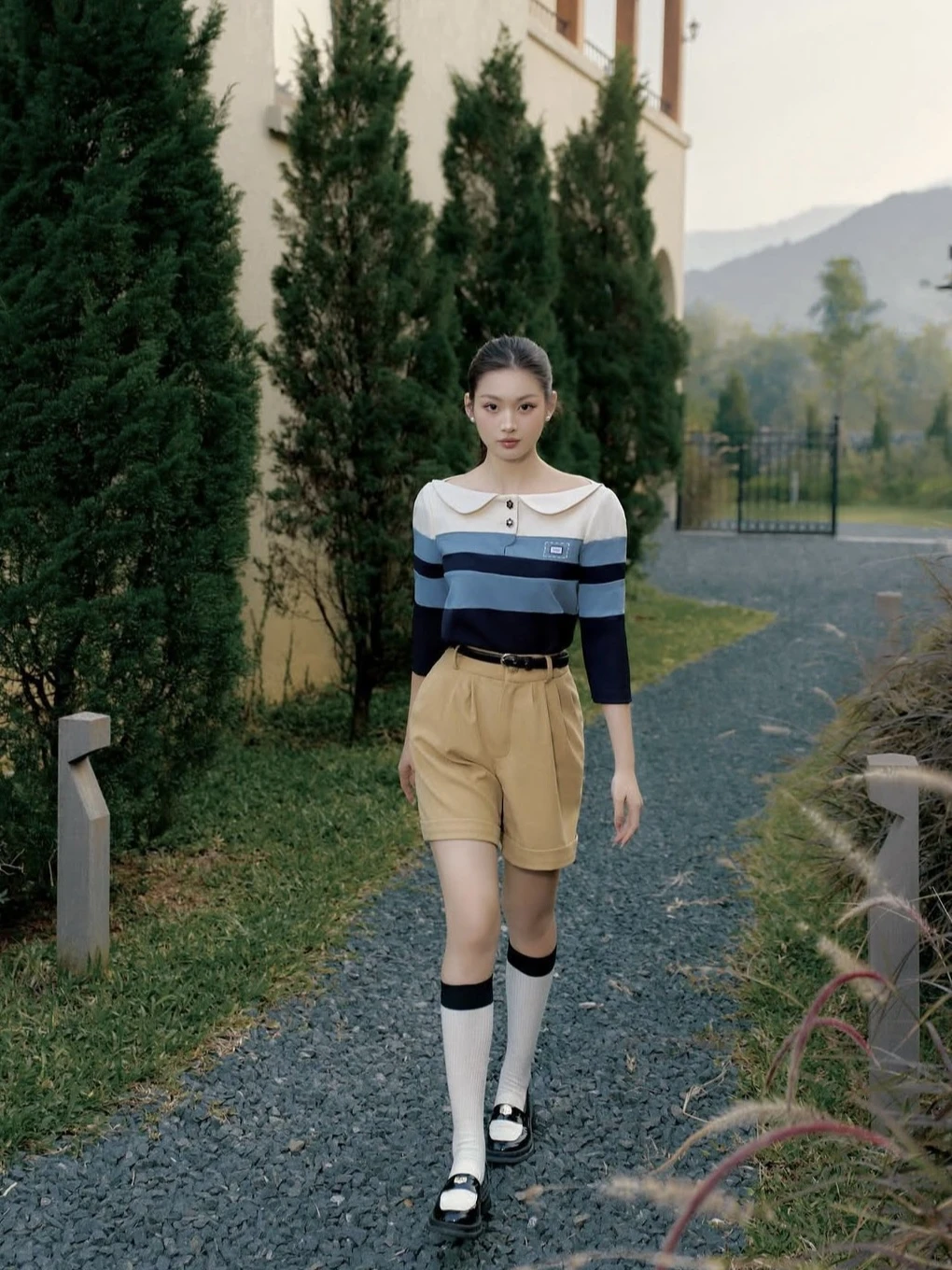 Sự kết hợp giữa áo len sọc ngang xanh, trắng, navy với quần đùi kaki màu be tạo cảm giác hài hòa. Đôi tất cao quá gối phối cùng giày đen mang hơi hướng cổ điển, tạo điểm nhấn duyên dáng mà vẫn năng động