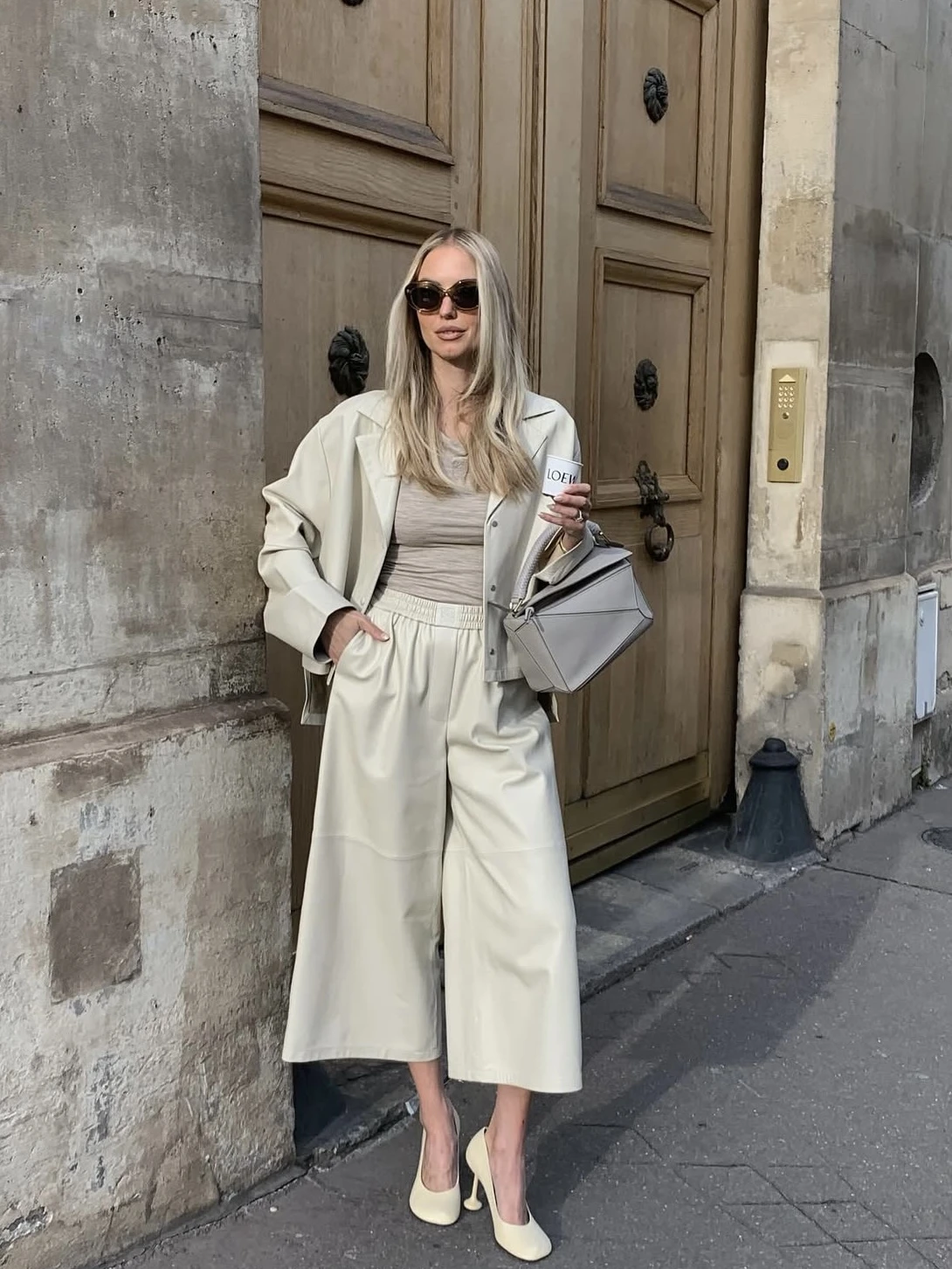 Nàng cũng có thể chọn cho mình bộ đồ phối giữa áo khoác crop và quần ống rộng từ chất liệu giả da mềm, cùng tông be sang trọng. Lớp áo màu trung tính bên trong giúp bảng màu trở nên liền mạch, tạo hiệu ứng tinh giản mà đẳng cấp