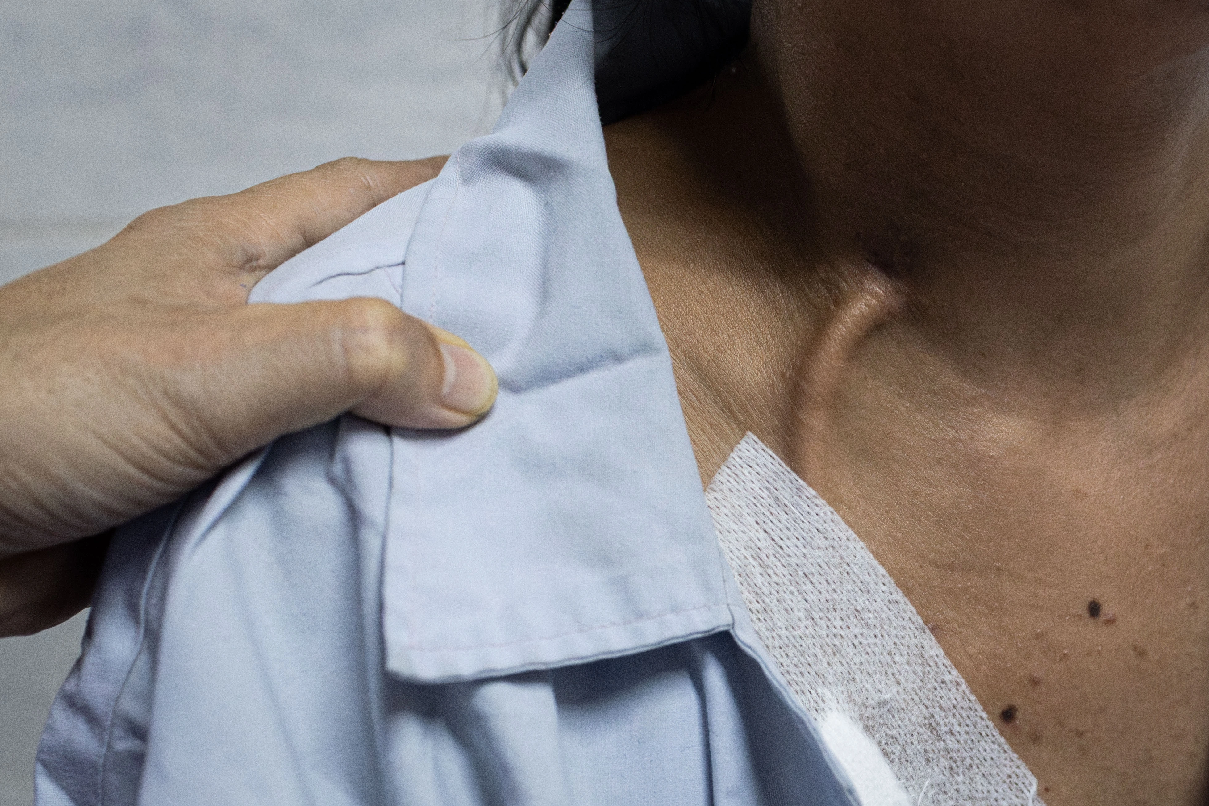 Chị Thanh Hiếu (38 tuổi, TP.HCM) đã gắn bó với khoa Nội thận - Lọc máu hơn 10 năm qua. Năm 28 tuổi, trong một ca phẫu thuật u nang, chị được phát hiện suy thận giai đoạn cuối dù trước đó không có dấu hiệu bất thường. Sau thời gian dài tự lọc màng bụng tại nhà, chị chuyển sang chạy thận định kỳ tại bệnh viện. Để tập trung điều trị, chị Hiếu buộc phải tạm dừng công việc giảng dạy yêu thích. Trong ảnh, ống catheter đặt tại vùng cổ giúp kết nối máy lọc máu với cơ thể.