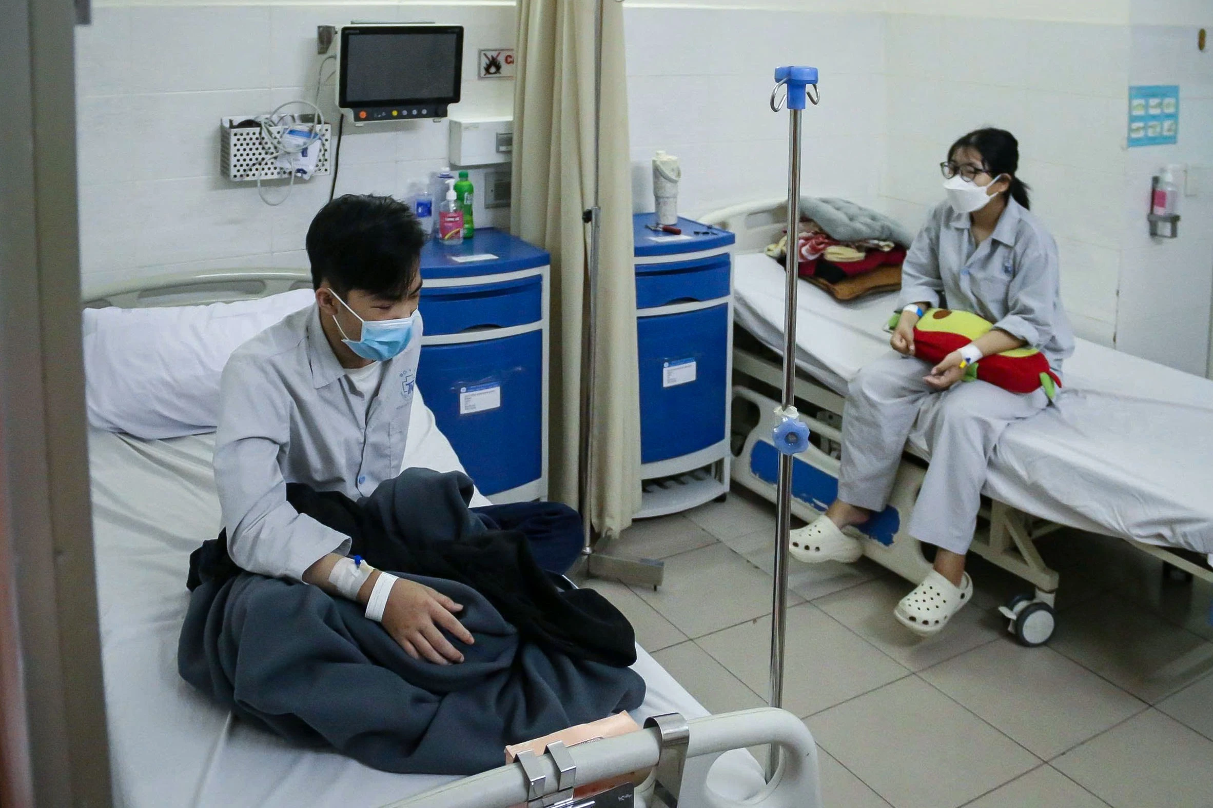 Khánh Vy (18 tuổi, bên phải) trò chuyện với người bạn cùng phòng bệnh. Vừa vào năm nhất đại học, nữ sinh bất ngờ được chẩn đoán suy thận do viêm cầu thận IgA. Trước đó, Vân thường thức đến 1-2 giờ sáng để làm bài và chạy deadline, chỉ thấy phù nhẹ ở tay, chân mà không hề đau hay sốt. "Đến khi đi khám, em mới biết mình đã mắc bệnh nặng", Vy nói.