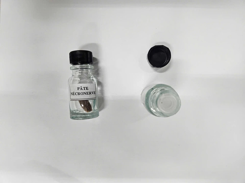 Tại đây, công an phát hiện cơ sở đang bày bán số lượng lớn sản phẩm ArsenicBlue 5g và Pâte Nécronerve (thường gọi là thuốc diệt tủy dùng trong nha khoa).
