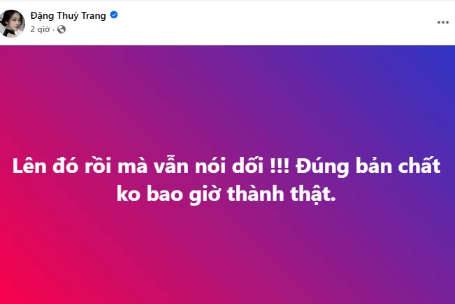 Đặng Thùy Trang nói tới việc ai đó vẫn quanh co nói dối nhưng không nhắc thẳng tên: “Lên đó rồi mà vẫn nói dối. Đúng bản chất không bao giờ thành thật”. Khi một cư dân mạng để lại bình luận bằng hình ảnh của Hoa hậu Thùy Tiên tại phiên tòa xét xử, Đặng Thùy Trang liền thả tương tác. Động thái này của cô khiến nhiều người nghi rằng đang ẩn ý nói tới Thùy Tiên.