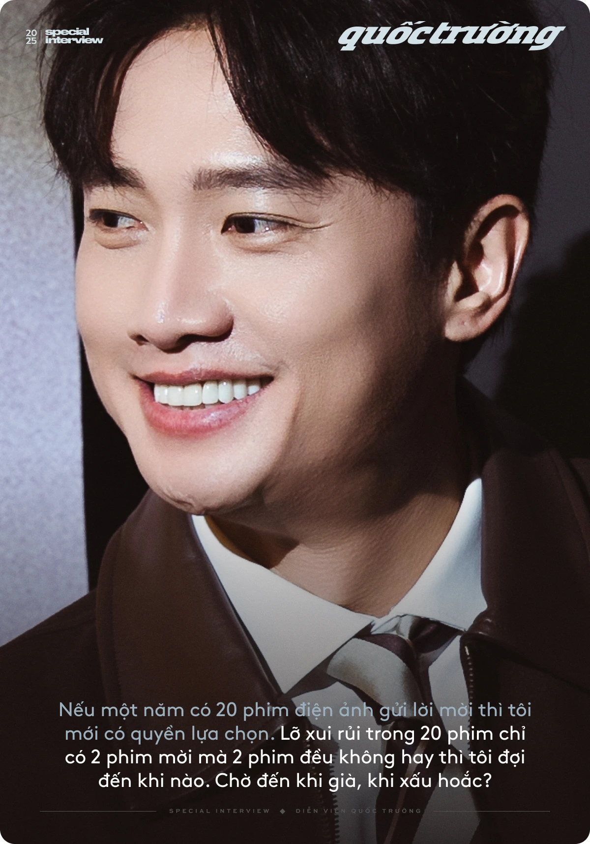 Mối quan hệ của tôi trong nghề cũng đâu có nhiều. Những vai hay chưa chắc người ta đã mời mình. Liệu có quyền để mà lựa chọn không? Nếu một năm có 20 phim điện ảnh gửi lời mời thì tôi mới có quyền lựa chọn. Lỡ xui rủi trong 20 phim chỉ có 2 phim mời mà 2 phim đều không hay thì tôi đợi đến khi nào. Chờ đến khi già, khi xấu hoắc? Hiện tại khán giả đang yêu thương Quốc Trường vì Quốc Trường đẹp trai, lên hình đẹp, diễn OK. Ví dụ như anh Thái Hoà, cũng không phải gu đẹp trai thì anh có quyền chọn. Dù lớn tuổi hơn thì anh vẫn là anh. Còn những bạn như Lee Min Ho, tổng tài Hàn Quốc thì ngồi chờ kịch bản hay để già luôn hay gì.