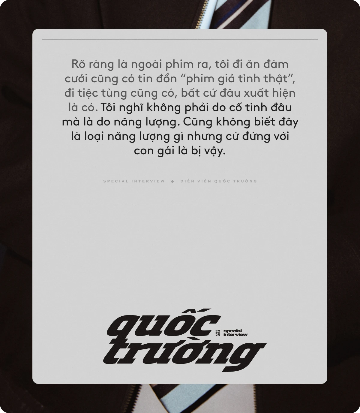 Rõ ràng là ngoài phim ra, tôi đi ăn đám cưới cũng có tin đồn "phim giả tình thật", đi tiệc tùng cũng có, bất cứ đâu xuất hiện là có. Tôi nghĩ không phải do cố tình đâu mà là do năng lượng. Cũng không biết đây là loại năng lượng gì nhưng cứ đứng với con gái là bị vậy.