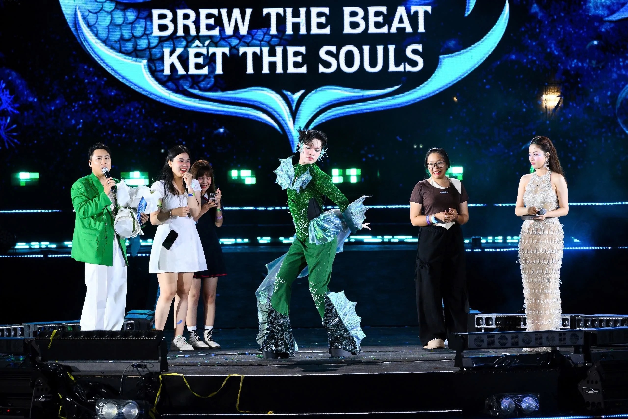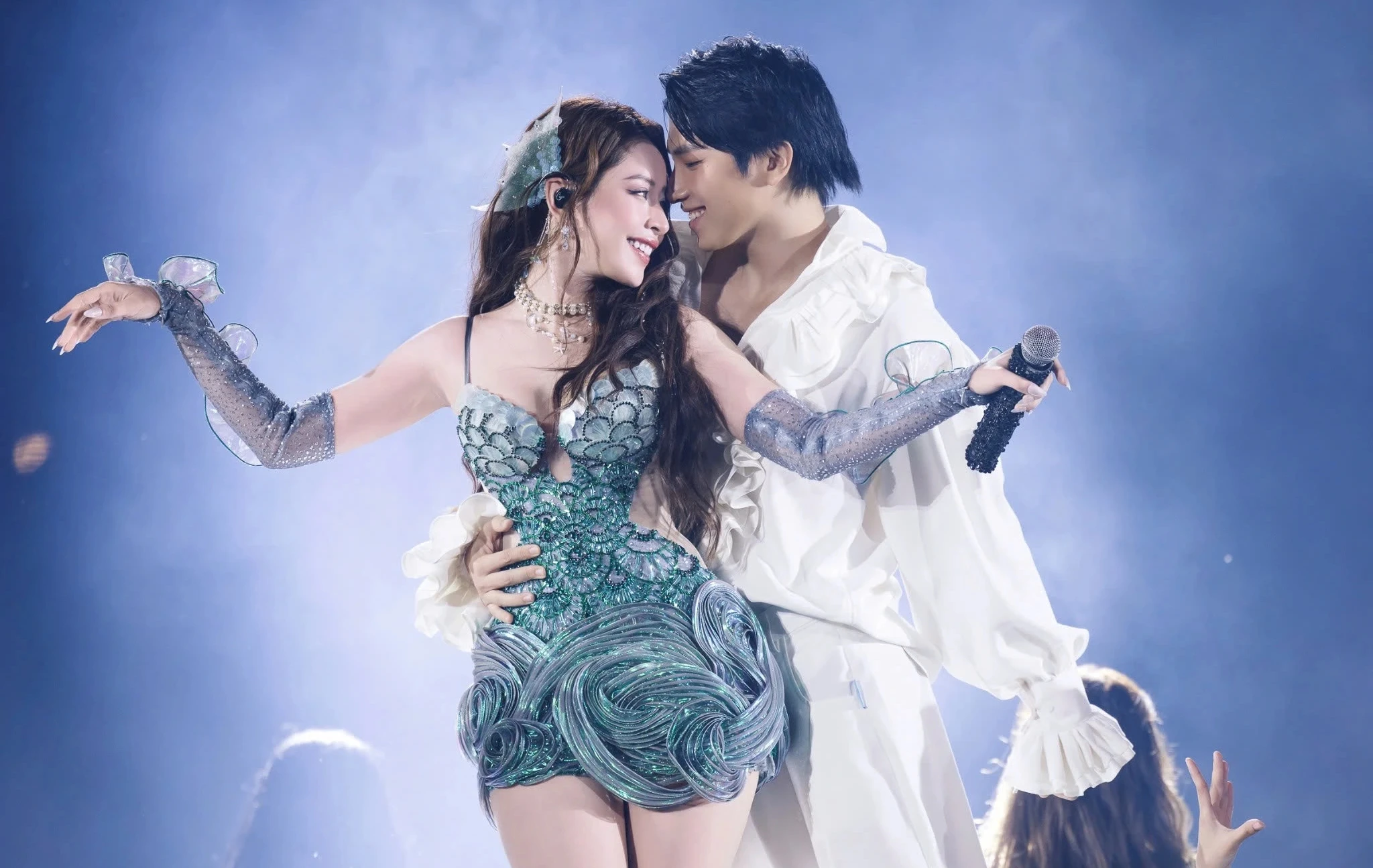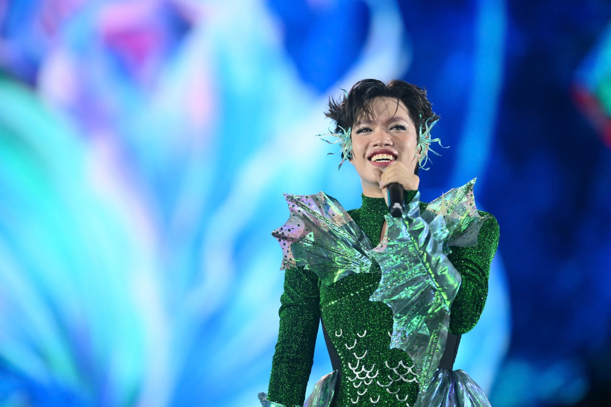 Xuất hiện trong bộ váy xanh lá rực rỡ, được thiết kế tinh xảo với những đường nét uốn lượn mô phỏng sóng biển, đính vảy cá lấp lánh và găng tay cách điệu, Chi Pu khiến người xem choáng ngợp ngay từ khoảnh khắc bước ra sân khấu. Đặc biệt, đôi tai được tạo hình vây cá càng làm nổi bật hình tượng nàng tiên cá của cô. Việc chuẩn bị kỹ lưỡng này cho thấy sự đầu tư nghiêm túc của Chi Pu cho mỗi lần xuất hiện trước công chúng.