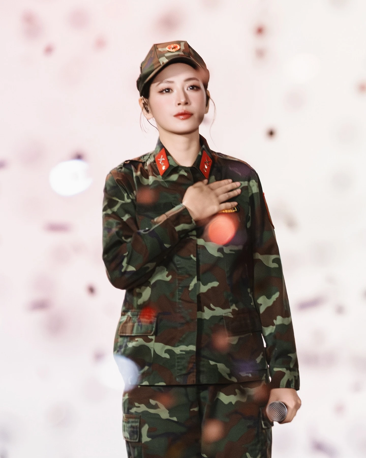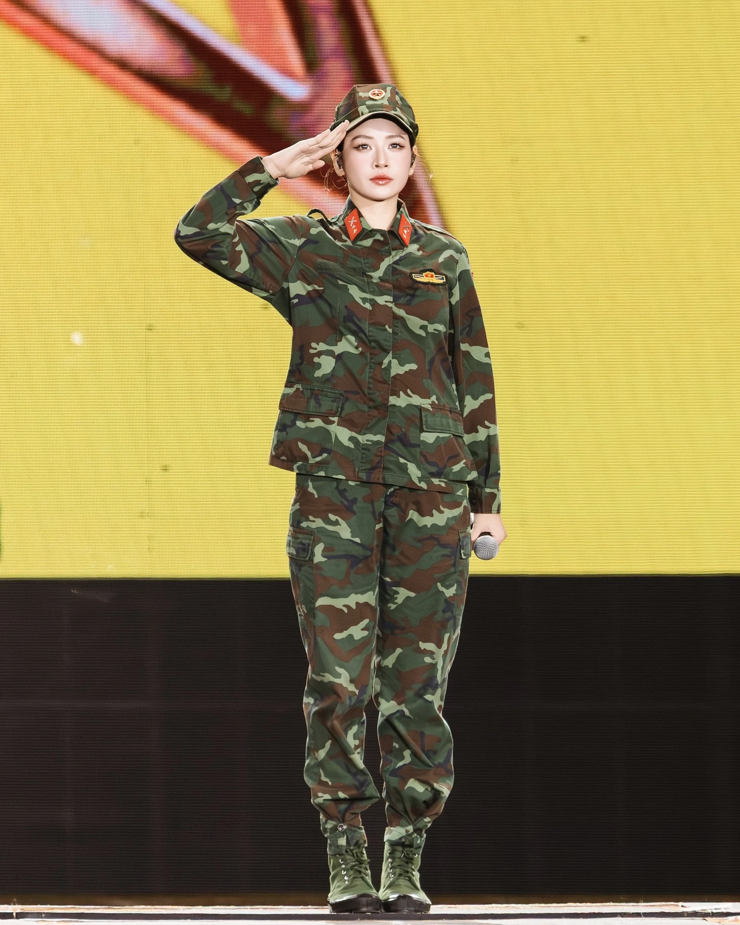 Điều đặc biệt đối với Chi Pu khi góp mặt tại Sao nhập ngũ concert 2025 là khoác lên mình trang phục áo lính để biểu diễn. Hình ảnh “cô gái mở đường” ấy càng tô đậm lòng yêu nước và truyền thống quân nhân của gia đình.