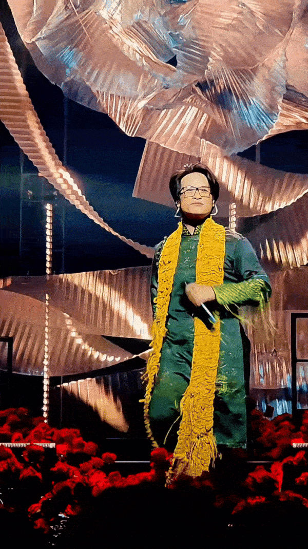 Có mặt tại đây còn là sự xuất hiện của Tuấn Ngọc, Thu Phương, Phan Mạnh Quỳnh…tham gia với tư cách khách mời trình diễn cùng ekip hơn 100 người. Bước đến bục sân khấu – nơi thường diễn ra Lễ trao giải Oscar danh giá, Hà Anh Tuấn diện lên mình bộ áo dài truyền thống màu lục, nhấn nhá với chiếc khăn choàng đặc biệt.