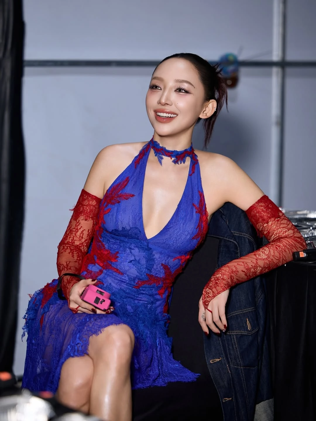 Sắc xanh cô ban độc đáo từ chiếc váy ren kết hợp cùng găng tay ren sắc đỏ tương phản thị giác đầy nổi bật. ẢNH: @TOCTIEN1305