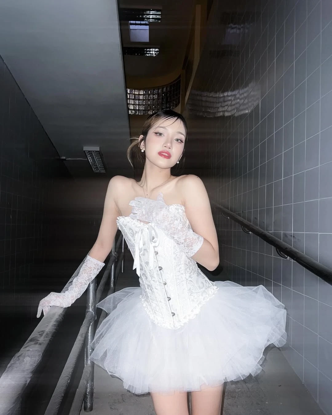 Chiếc váy corset kết hợp vải voan và ren mang nét cổ điển của những thập niên trước, kết hợp với găng tay ren mỏng càng hoàn thiện vẻ ngoài trong trẻo thu hút