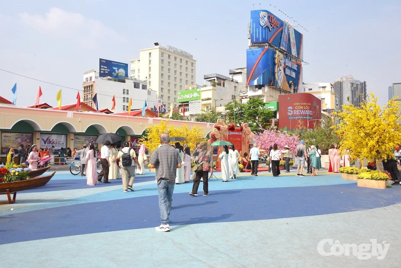 Từ sáng đến tối muộn, chợ Bến Thành luôn tấp nập, từng tốp người rảo bước giữa các tiểu cảnh hoa rồi tiếng cười nói rộn ràng hòa cùng dòng xe cộ nhộn nhịp khiến khung cảnh nơi đây trở nên sôi động hơn bao giờ hết.