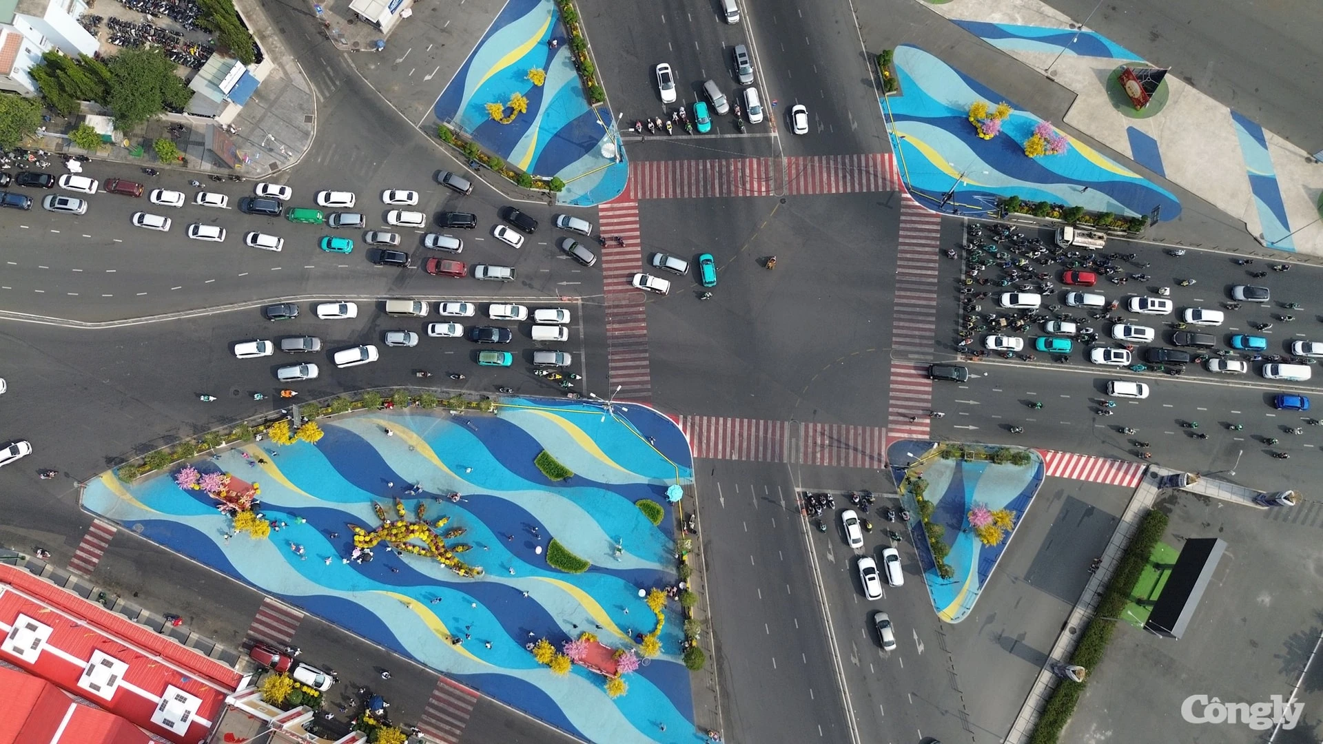 Phía trước cổng chợ, các tiểu cảnh trang trí Tết được bố trí thành từng cụm sinh động với hoa cúc mâm xôi vàng rực, mai vàng, đào hồng và những chiếc ghe gỗ nhỏ xếp thành hình cánh hoa trên nền quảng trường sơn xanh – vàng uốn lượn.