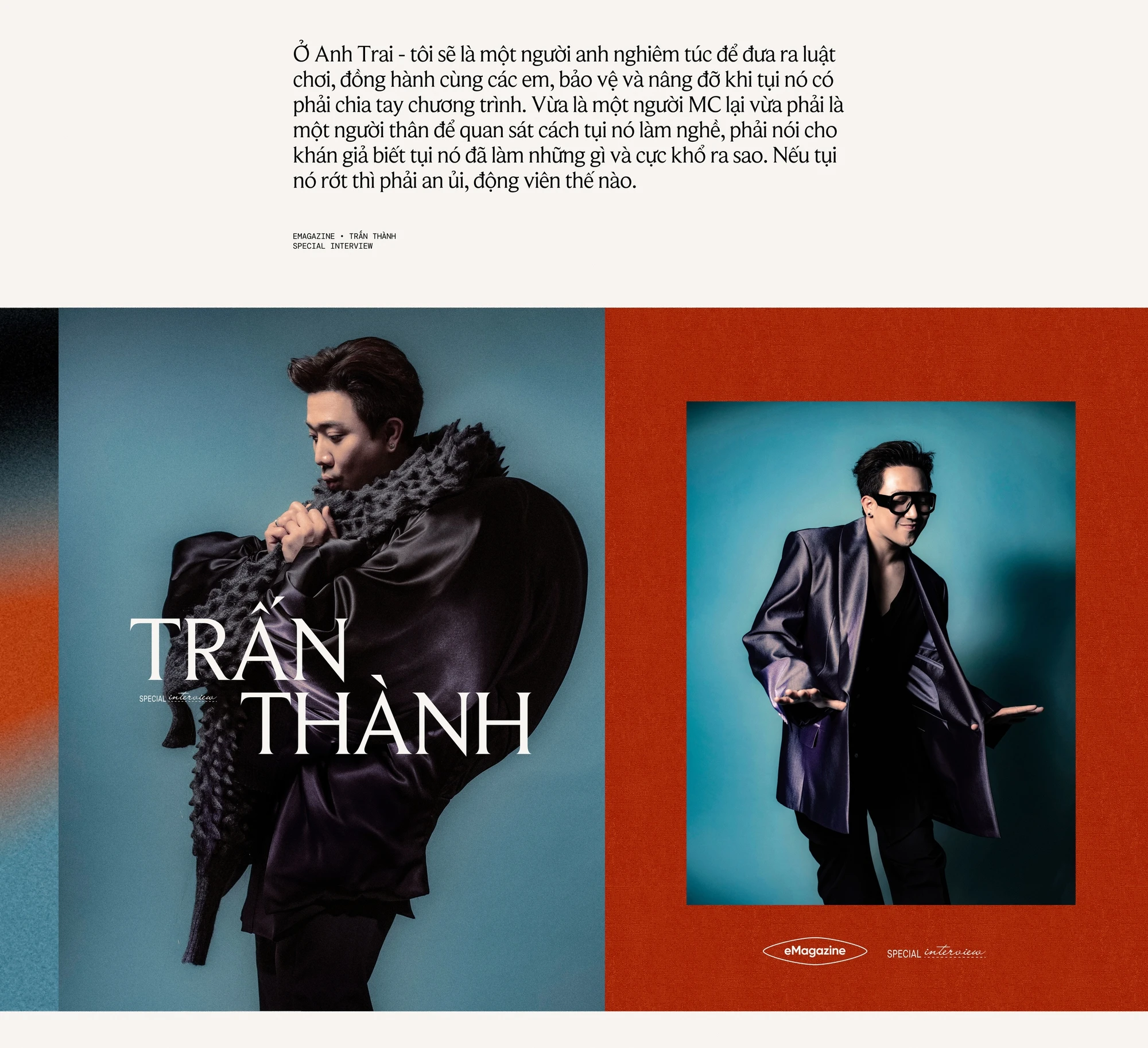 Về việc liên tục nhận show và làm cách nào để khác biệt, hoàn thành vai trò, Trấn Thành bộc bạch: "Ở Anh Trai - tôi sẽ là một người anh nghiêm túc để đưa ra luật chơi, đồng hành cùng các em, bảo vệ và nâng đỡ khi tụi nó có phải chia tay chương trình. Vừa là một người MC lại vừa phải là một người thân để quan sát cách tụi nó làm nghề, phải nói cho khán giả biết tụi nó đã làm những gì và cực khổ ra sao. Nếu tụi nó rớt thì phải an ủi, động viên thế nào. Qua Running Man thì lại là một nhân vật khác, lầy lội, hài hước hơn. Tôi nghĩ, mỗi chương trình lại có một keyword để mình nắm được tinh thần chung của nó, bám vào đó để có thể đóng được nhiều vai trò khác nhau trong nhiều show khác nhau mà không bị lặp lại".