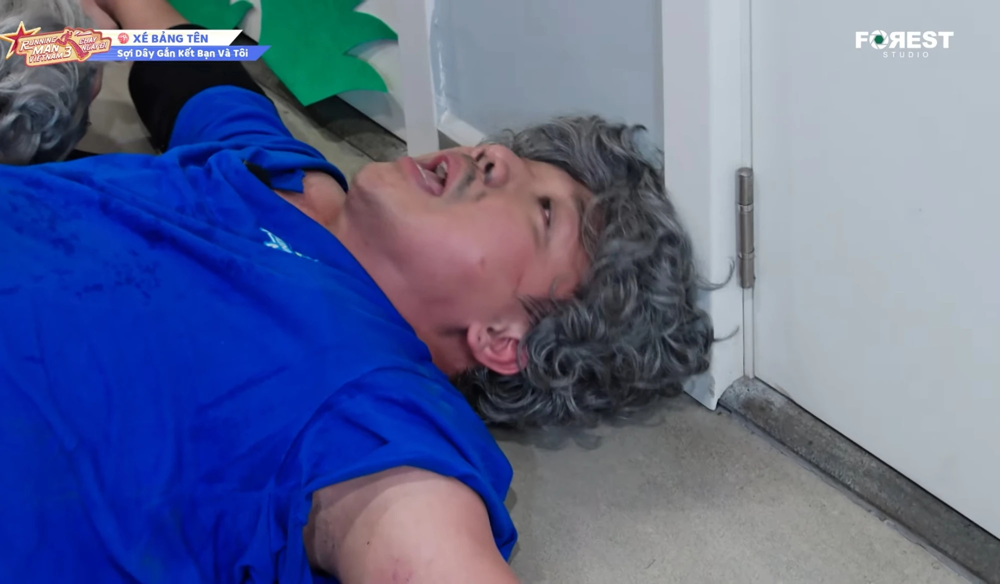 Trấn Thành nằm thở hổn hển sau khi đã xé được bảng tên của Quang Trung