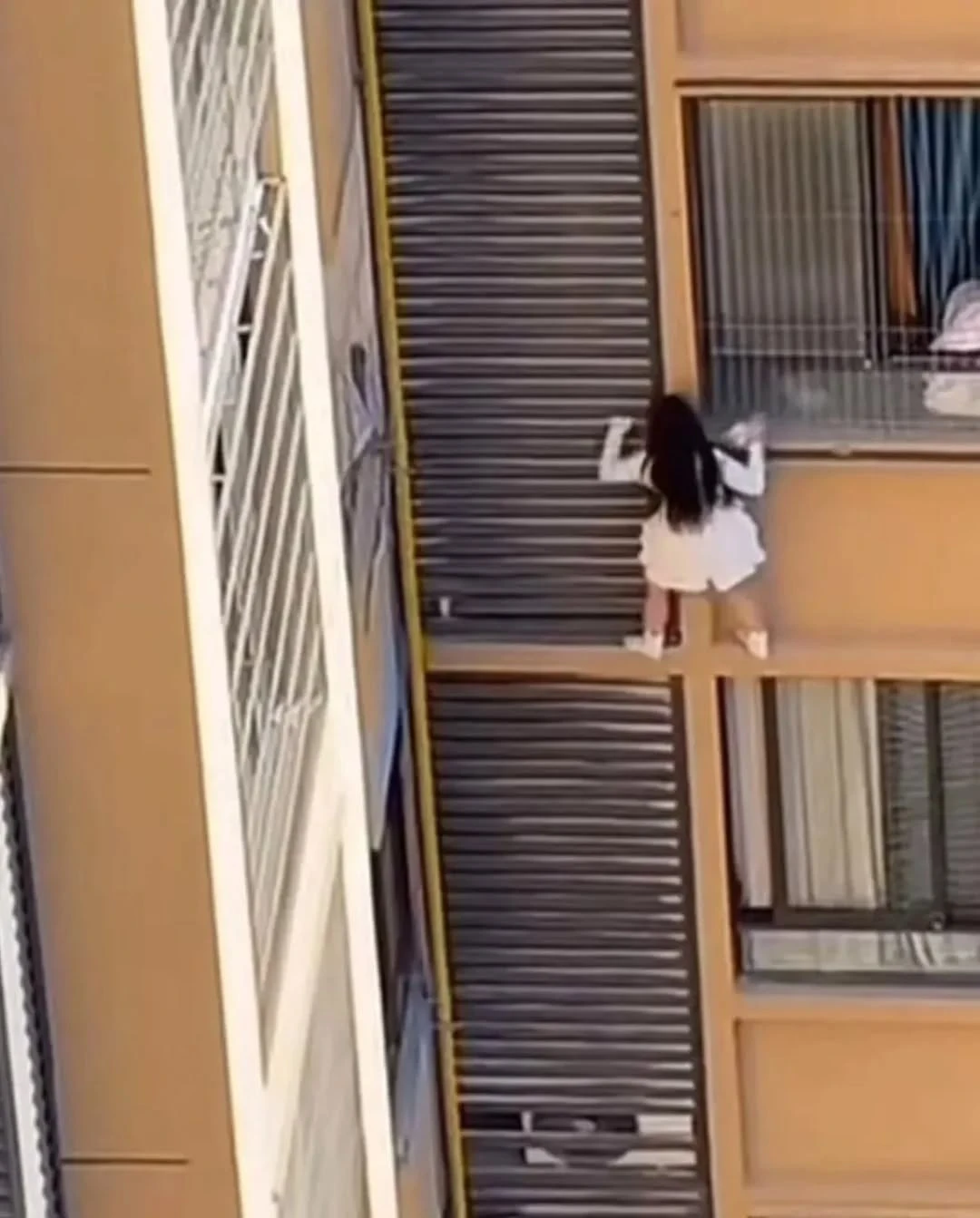 Người này cho biết đây là tầng 10 của một căn chung cư, lúc đang vô tình quay khung cảnh thì bắt gặp cô gái mặc váy trắng trèo ra khỏi cửa sổ tầng cao, dường như đang rất hoảng hốt và muốn trốn thoát .