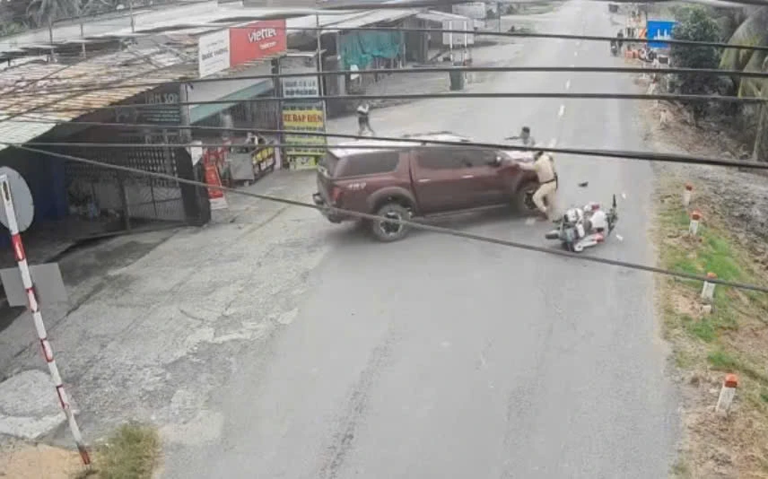 Tài xế ô tô bán tải nghi dùng biển số giả tại Tây Ninh liều lĩnh húc ngã mô tô đặc chủng của CSGT rồi tăng ga bỏ chạy khi bị kiểm tra vì chạy quá tốc độ.