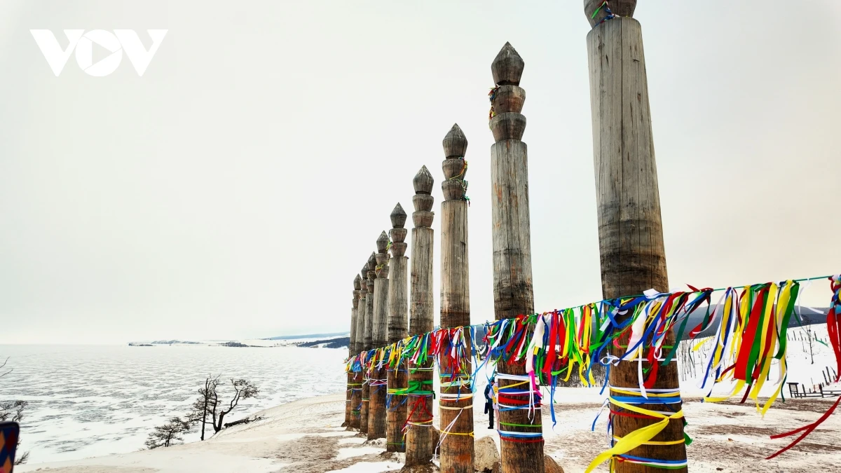Trên đảo Olkhon, gần mũi đá Shaman, các trụ gỗ thiêng đứng lặng trước gió, tượng trưng cho sự kết nối giữa con người và thần linh