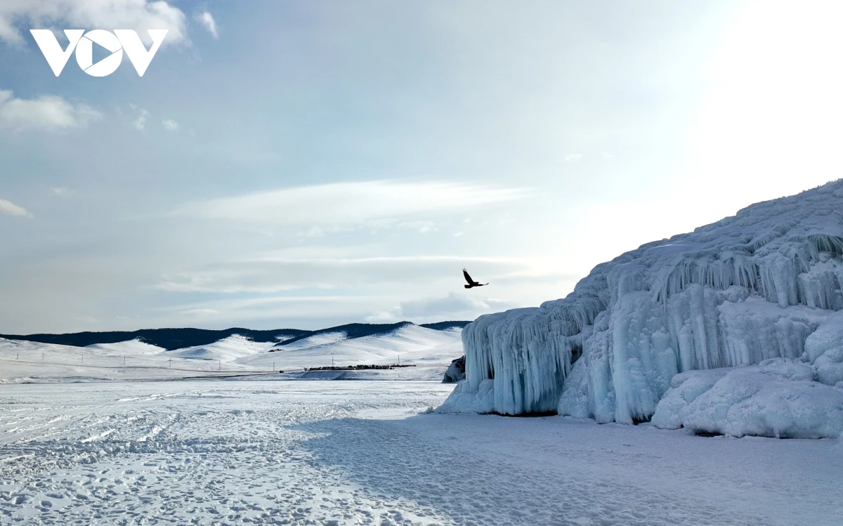 Trên hành trình tới đảo Olkhon – trái tim của Baikal, những dãy núi tuyết khi ẩn khi hiện sau màn sương lạnh, như một lời mời kín đáo dẫn lối du khách tiến sâu hơn vào thế giới bí ẩn phía trước. Người ta tìm đến đây để chiêm ngưỡng mặt hồ băng trong vắt như pha lê, nơi từng lớp băng xếp chồng thành những vệt sáng xanh thẳm. Từ vách đá ven bờ, những dải băng rủ xuống như chuỗi ngọc lấp lánh giữa trời đông, lặng lẽ ghi dấu ấn thời gian. Nằm trên mặt băng, giữa không gian tĩnh mịch ấy, người ta có cảm giác như nghe thấy Baikal đang thì thầm một cách chậm rãi và đầy nội lực, như tiếng thở cổ xưa của Trái Đất.