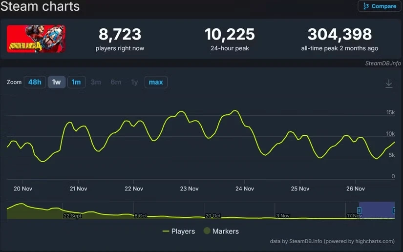 Ngay cả việc giảm giá dịp cuối năm cũng không khiến lượng người chơi phục hồi, một tín hiệu cho thấy vấn đề nằm ở bản thân nội dung, không phải giá bán. Khác với nhiều tựa game hướng dịch vụ, Borderlands 4 không phụ thuộc hoàn toàn vào số người chơi cùng lúc để duy trì hoạt động. Tuy nhiên, con số giảm tới 96% chỉ sau hai tháng rõ ràng là tín hiệu không mấy tích cực, nhất là khi game vẫn đang được bổ sung nội dung mới.