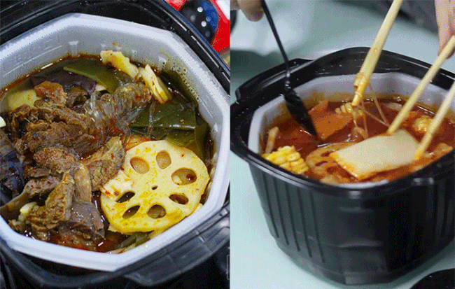 Chính xác là lẩu ăn liền đó, vì giống như mỳ gói chúng ta hay ăn, chỉ cần bỏ gia vị, sốt vào bát, múc nước sôi vào chờ một lúc là có thể chén liền. Thì ở đây với món lẩu này sẽ có hộp nhựa bao gồm 2 hộp lồng vào nhau và 7 gói nhỏ bên trong, bao gồm: rau củ sấy khô, thịt bò/gà/vịt sấy khô, miến, sốt, ớt, túi đũa thìa và đặc biệt là một gói sẽ làm lẩu tự sôi lên được.