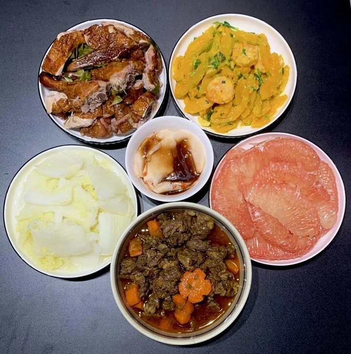 Mâm cơm này có vịt quay, bò sốt tiêu, bí ngô xào, cải thảo luộc và tráng miệng bằng bưởi.