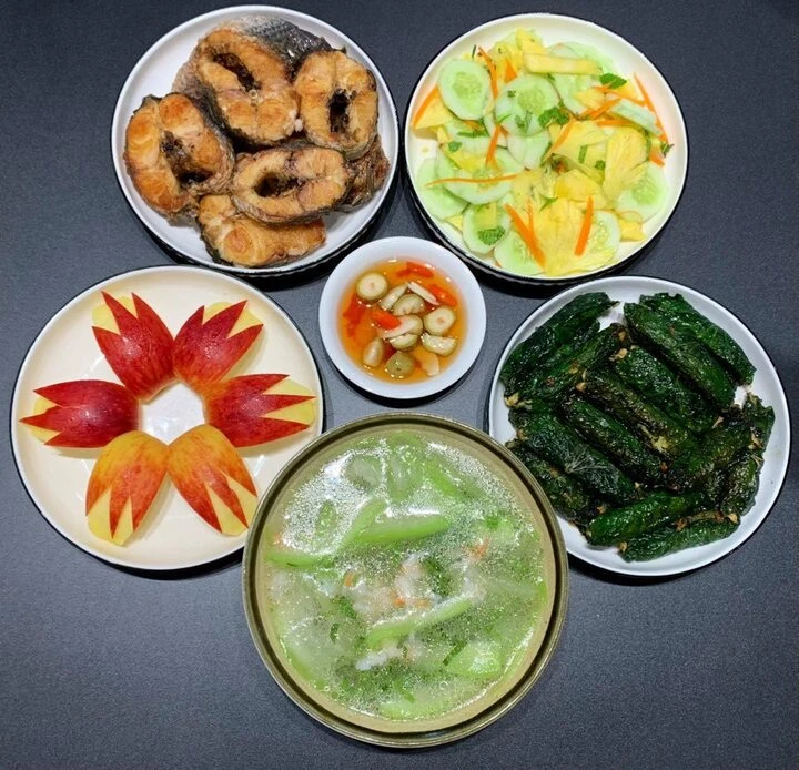 Thảo Nguyên cho biết, mỗi mâm cơm chị nấu đều có một món mặn, một món phụ, một món xào, một món canh hoặc món luộc và cả món tráng miệng, vừa đảm bảo đầy đủ dưỡng chất, vừa cân bằng khẩu vị. Tiêu chí nấu ăn là hạn chế tối đa dầu mỡ, ưu tiên các món thanh mát dễ làm, dễ ăn mà đủ dinh dưỡng.