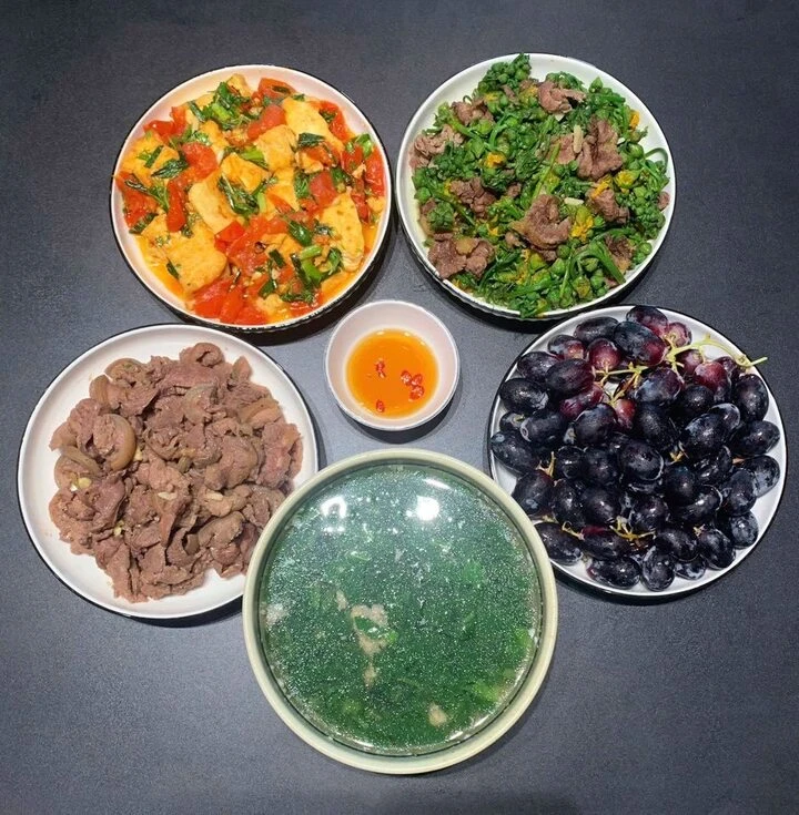 Mâm cơm có bê xào tỏi, bò xào nụ mướp, đậu sốt cà chua, canh và tráng miệng bằng quả nho.