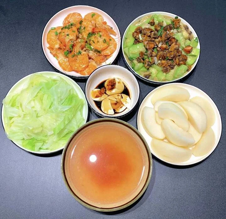 Món chính là tôm rim, cồi sò gạo xào mướp, rau luộc, tráng miệng bằng quả lê.